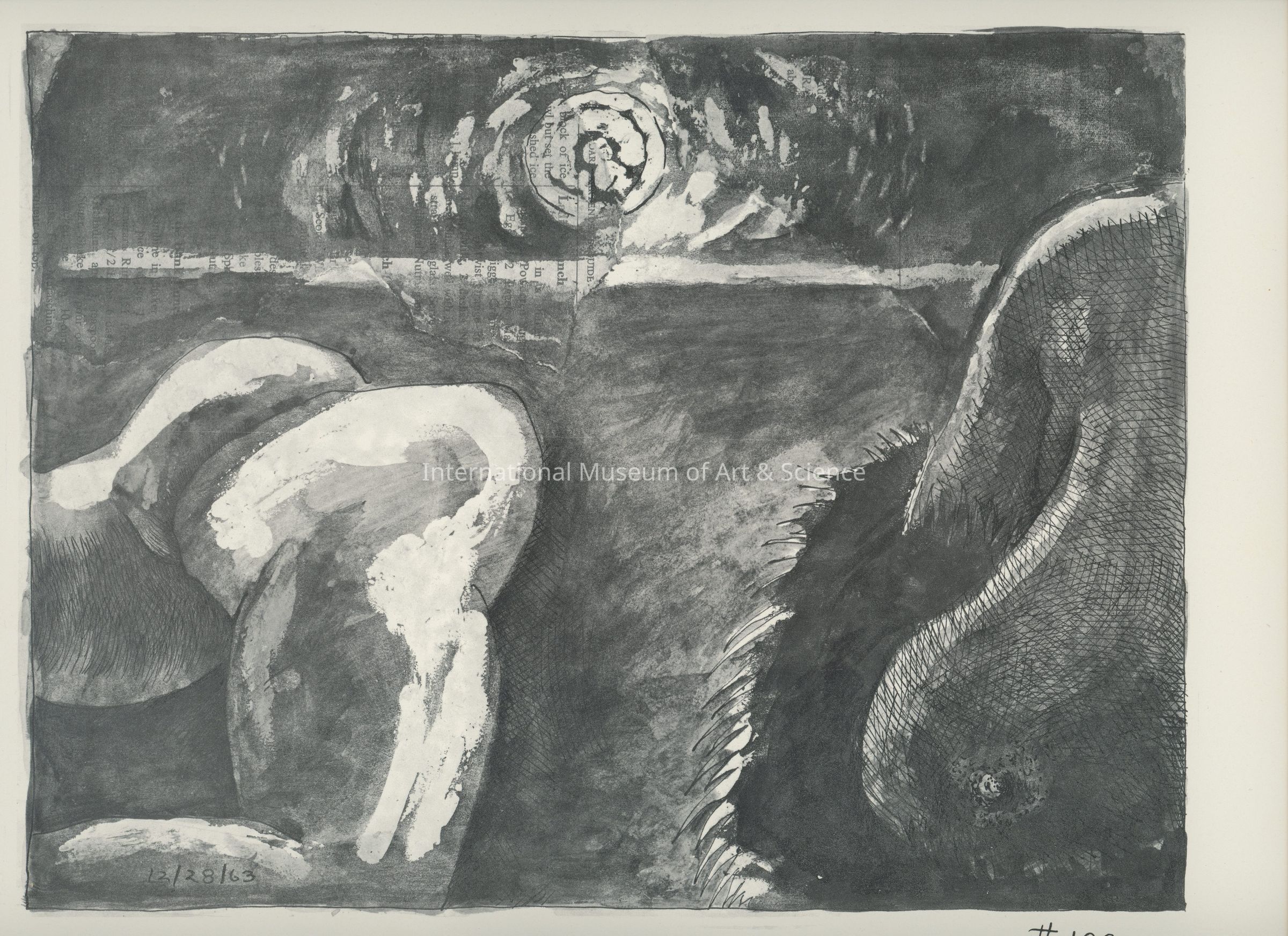 A offset lithograph. This print is part of a 169 piece set entitled: Death is All the Time. The prints are divided into two parts and then sub-grouped again. Part II: Aftermath (Drawings 53 - 169). Prints 91 through 131 are entitled: Nox-Dies or "Night-Dies". 106 through 131 are sub-titled: Night (Nox).