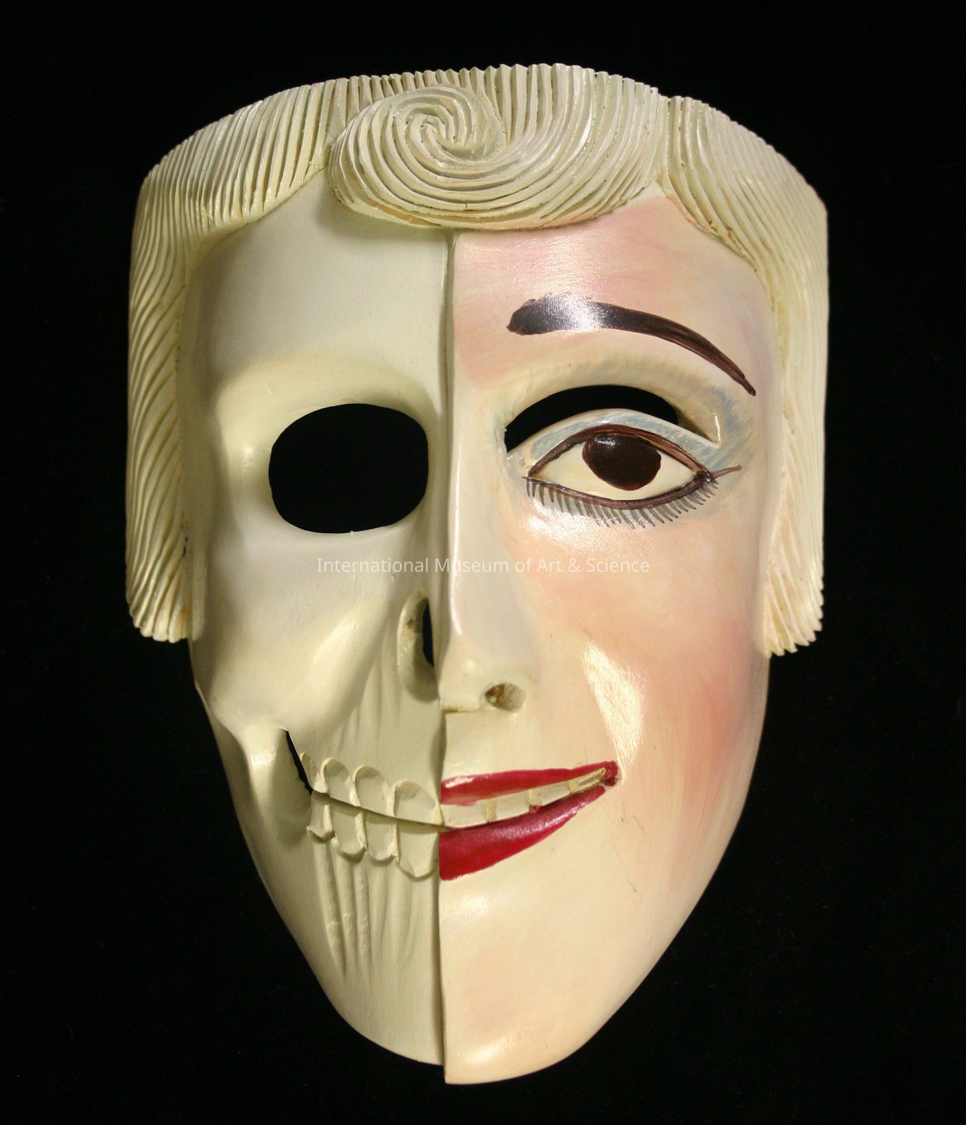 A half skull/ half human face mask. The skull section is painted a glossy white. The female side has rosy cheeks, red lips, and black eyebrows. The skull eye is wide, while there is a slit above the female's eye for the wearer to see through. The hair is carved and painted white.Artwork Details