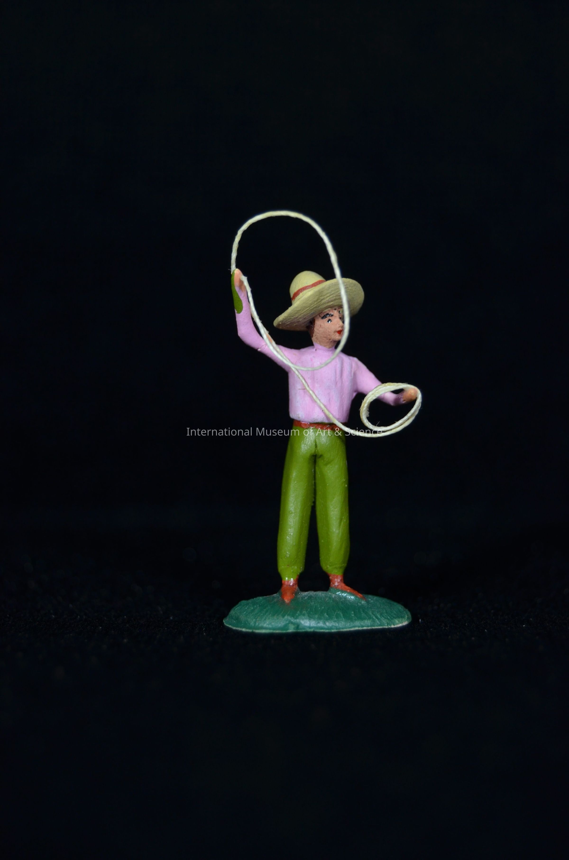 A small figurine. the figurine is made of clay and then painted. It depicts a cowboy holding a rope over his head, trying to lasso. The figure is wearing a lavender shirt, green pants, and a large hat. He is part of a rodeo scene of a run away horse being chased by two horse riders and standing figures with rope.