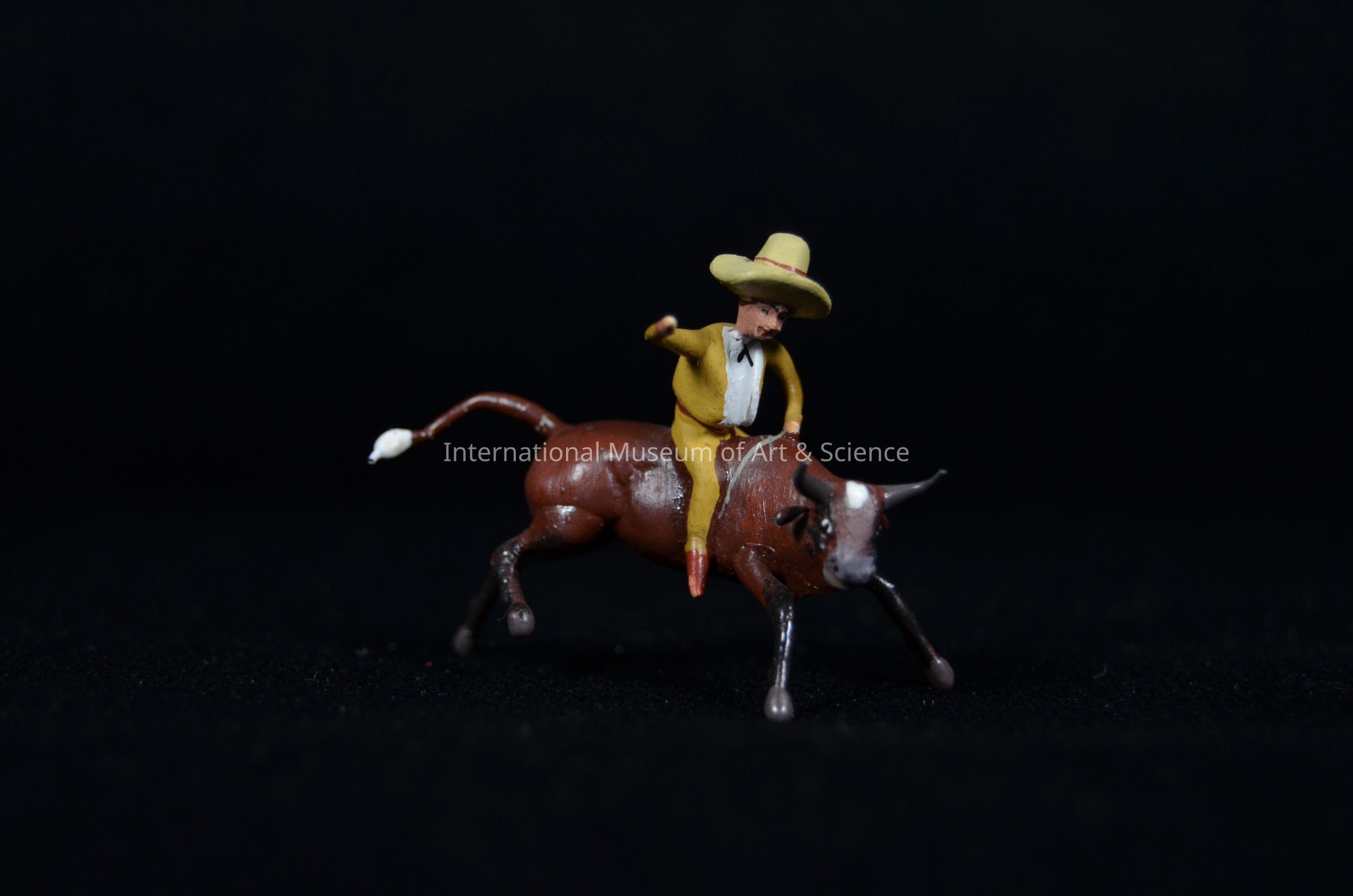 A small figurine. The figurine is made of clay and then painted. It depicts a brown galloping horse. The figurine is part of a rodeo scene of a run away horse being chased by two horse riders and standing figures with rope.Artwork Details