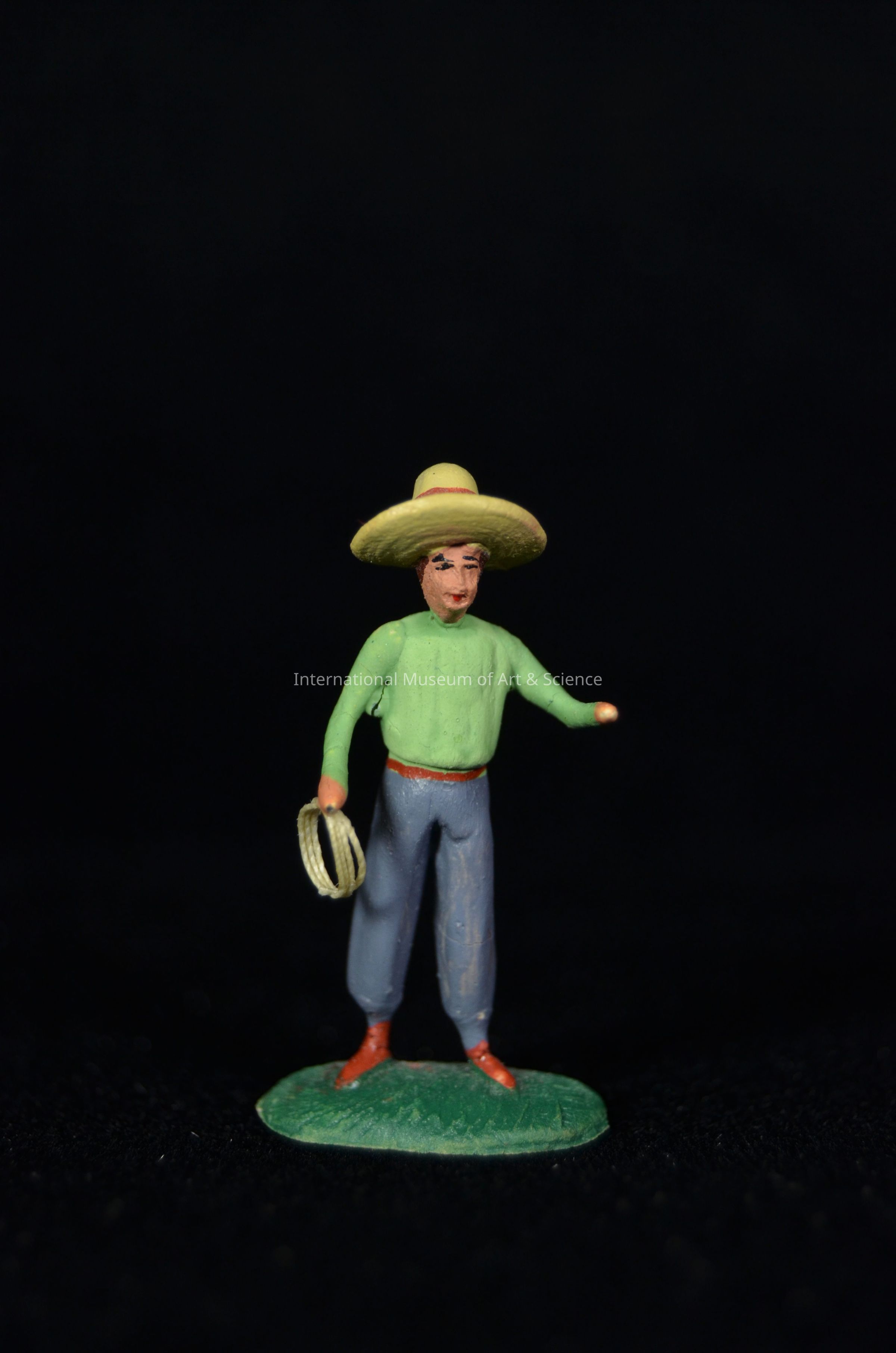 A small figurine. the figurine is made of clay and then painted. It depicts a cowboy holding a rope. The figure is wearing a green shirt, blue pants, and a large hat. He is part of a rodeo scene of a run away horse being chased by two horse riders and standing figures with rope.Artwork Details