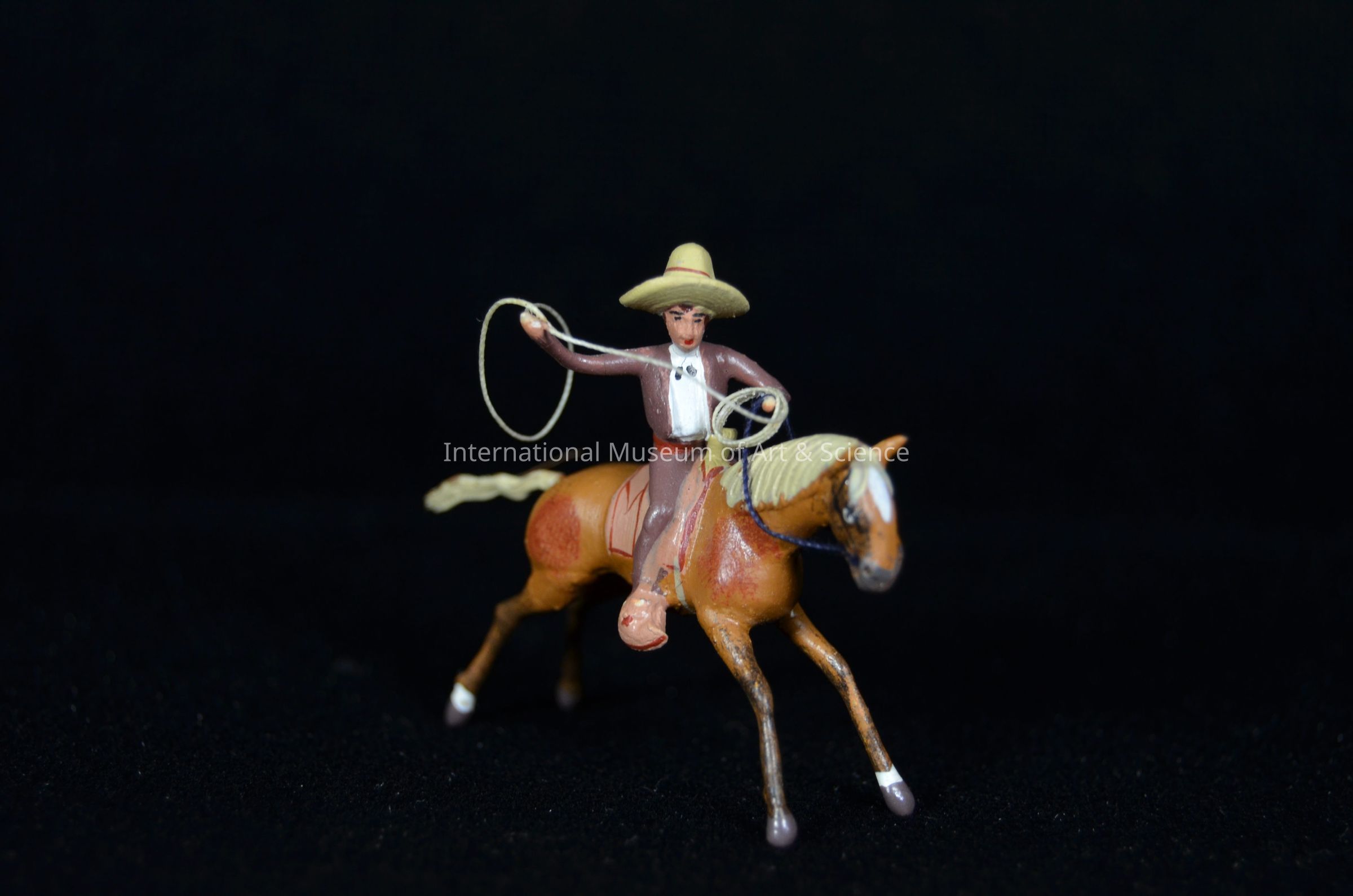A small figurine. The figurine is made of clay and then painted. It depicts a cowboy riding a horse and holding a rope. The figure is wearing a white shirt, brown jacket, brown pants, and a large hat. He is part of a rodeo scene of a run away horse being chased by two horse riders and standing figures with rope.Artwork Details