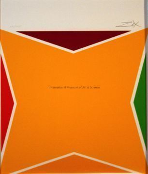 "December". Four-pointed gold star form on diagonal triangle corners of red, red-orange, light green and orange-yellow.Dimensions