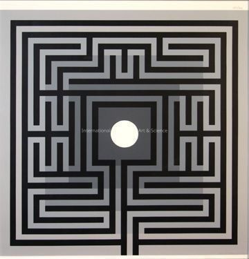 "December". John Willenbecher, American. Silkscreen. 1973. Printed in Stuttgart, West Germany.Central white spherical shape surrounded by black fret designs; background of four gray tones; a maze appearance; white circle at center; 62/130.Artwork Details