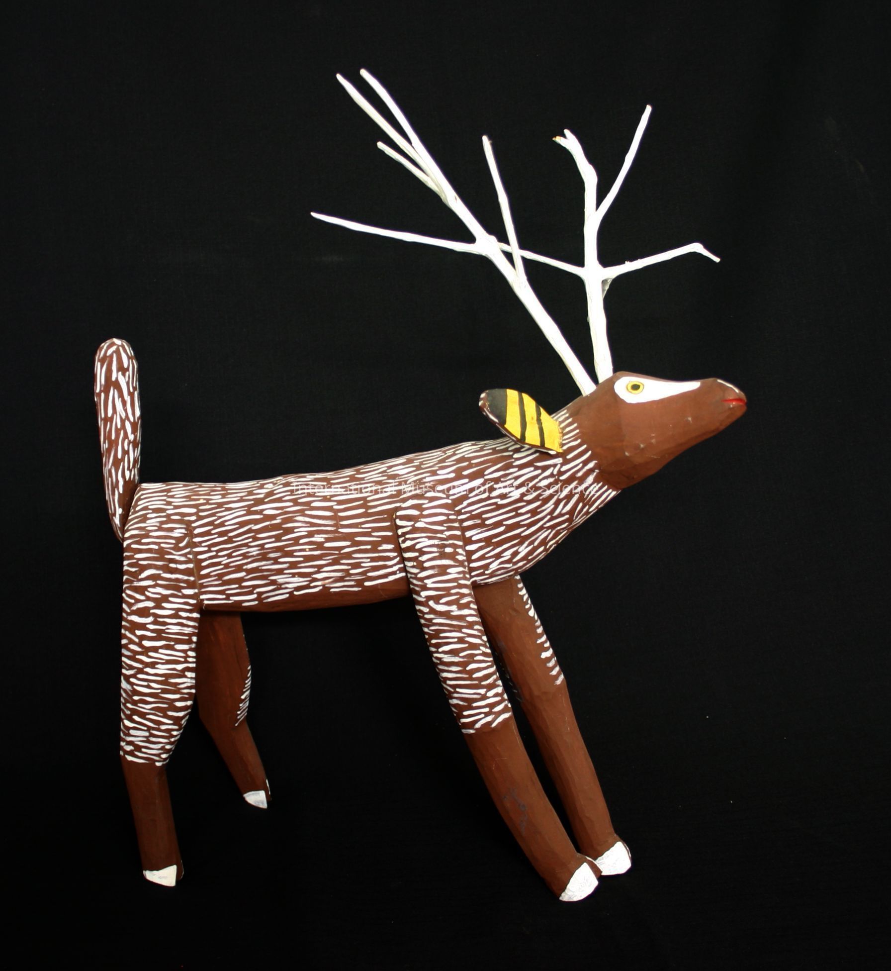 Deer painted dark brown with white dashes; yellow with black striped ears; white on yellow eyes; white antlers (removable).Made/Created