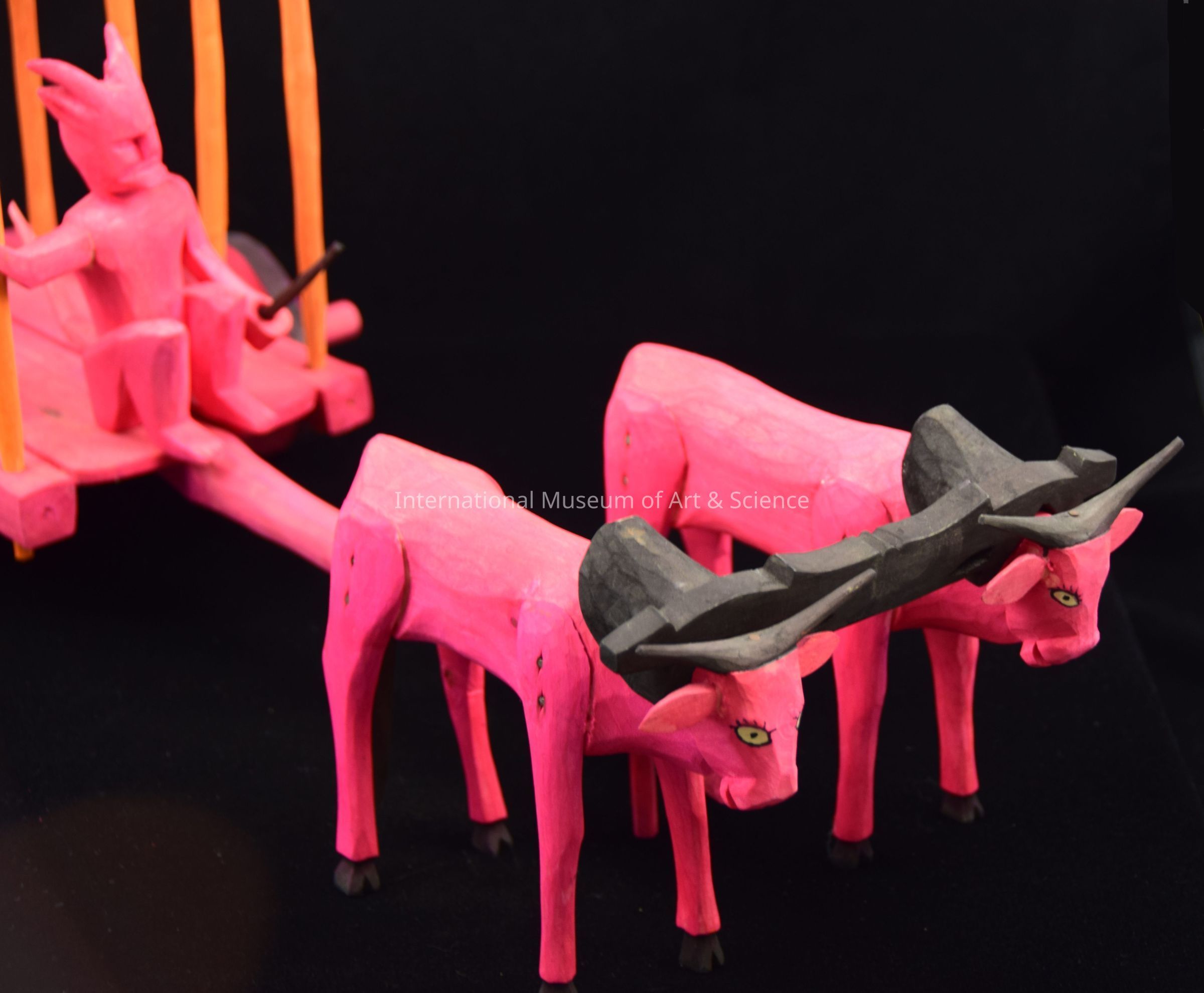 A carved figurine of an ox. The figurine is carved from wood and has been stained bright pink with black detailing. The ox is part of a group of figurines that is titles "Devil Cart."