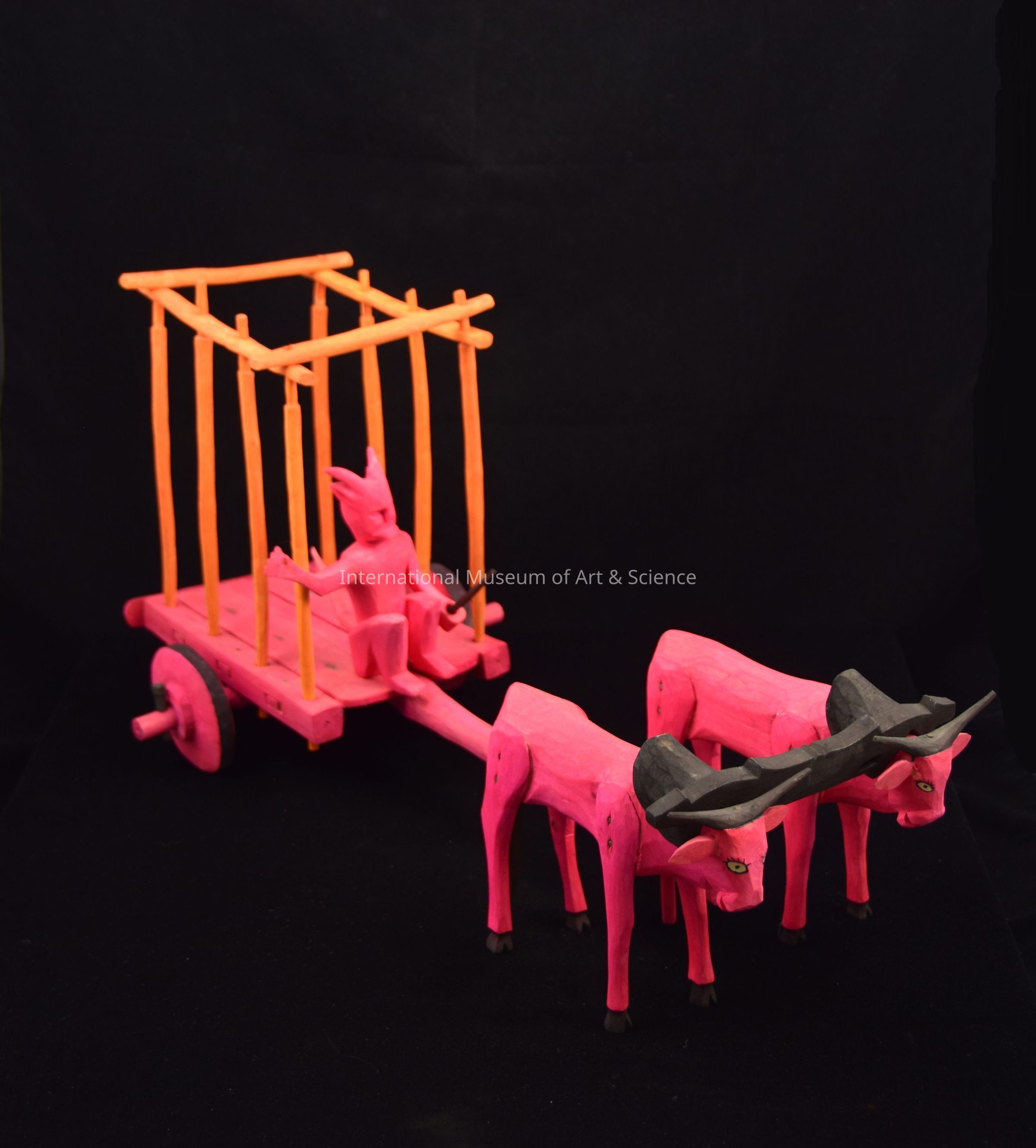 A small wooden cart, carved from wood. The cart consists of a flat cart base with an axel attached for the two wheels to attach. The cart base has four holes on each side to place posts. The posts are painteded orange, while the cart base the wheels are painted bright pink with black detailing. There are 17pieces under this number: 1 cart base with axel, 2 wheels, 2 pins that hold the wheels on, and 12 posts. The cart is part of a group of figurines titles, "Devil Cart." The scene shows a cart driven by seated devil holding black stick, with two dark pink oxen with black horns pulling the cart.