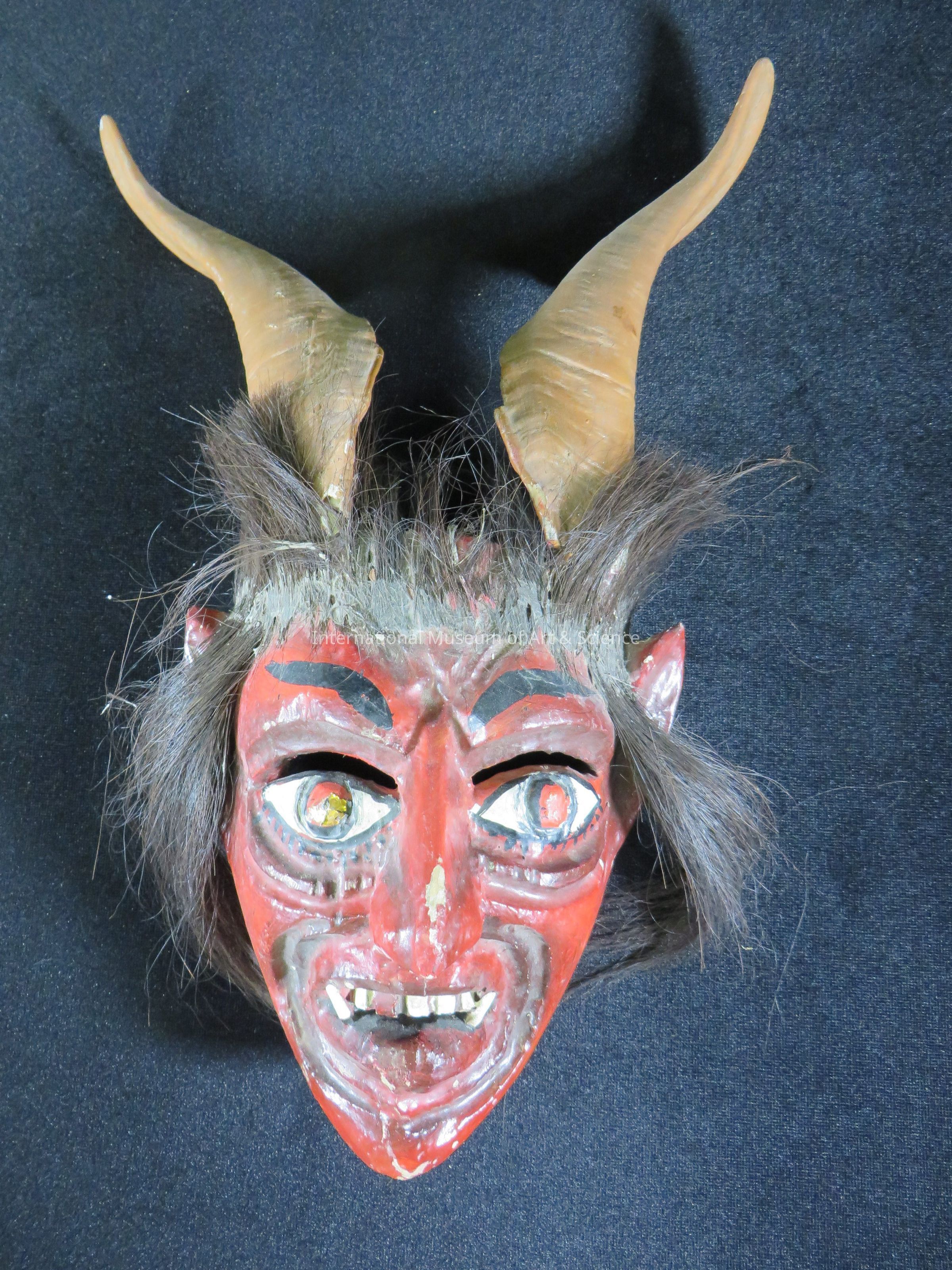 Devil Mask. Horns nailed on; black hair; painted eyes w/gold foil; red face; two wooden teeth inserted below painted teeth; opening above eyes and at mouth.Artwork Details