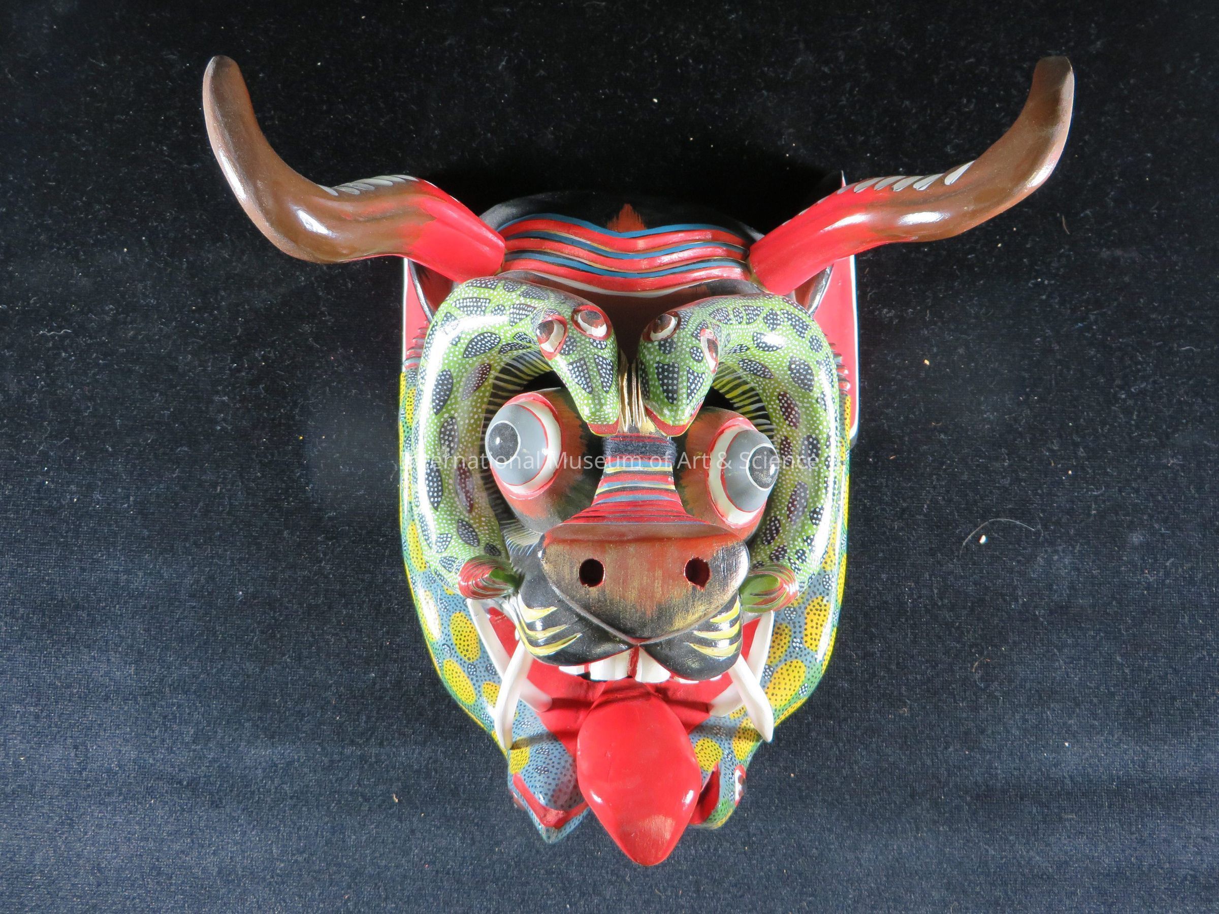 "Devil Mask". Multi-colored wooden mask. Four high-relief carved snakes cling to face; two light green snakes with black oval splotches on body, covered with white small spots curl around the devil's eyes. Other two snakes are painted blue-green with yellow oval splotches on body, covered with tiny black and white spots and are upside down clinging to the sides from the devil's ears to his chin. Devil has round protruding eyes with projected eyeballs painted brown, outlined in red, gray, and white bands, and black pupils. Sharp pointed ears are painted black, interior red, outlined in white forehead and has worry lines painted blue, red, white with yellow. Two horns protrude from forehead painted red with brown and have incised decorations painted white with black. Overall background painted black with red-brown, under eyes stripes of yellow and white. Long protruding nose with flat oval nose tip. Nose has two carved holes as nostrils. Bands painted red, blue black yellow and white. Mouth painted dark red with long carved tongue solid red. With white sharp and curved teeth; two on the upper lip and the other two on the lower lip. Ten square carved teeth painted white and touch of gold on eyebrows and nose.Artwork Details