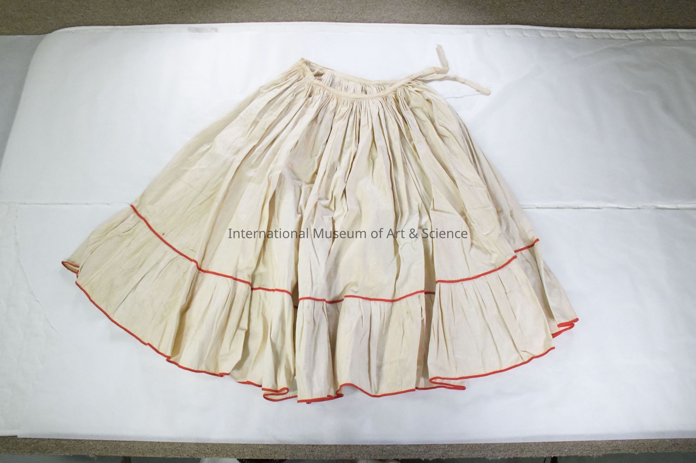 This three-piece ensemble includes a hand-sewn cotton blouse, a full gathered skirt, and a twisted cotton headband, all in a plain natural white tone. The blouse features full-length sleeves gathered at the cuffs, a straight cut body, and minimal decoration, aside from dark red bias tape edging a central opening, which ends in a stitched tab. The skirt is voluminous and tiered, gathered at the waistband with a drawstring closure. Its wide hem and tier seams are accented by a narrow red trim. The accompanying headband is a twisted strip of matching cotton cloth, likely worn wrapped around the head and knotted. The outfit was likely originally paired with a wide handwoven wool sash to fasten the blouse inside the skirt, although the sash is not included.Ethnography