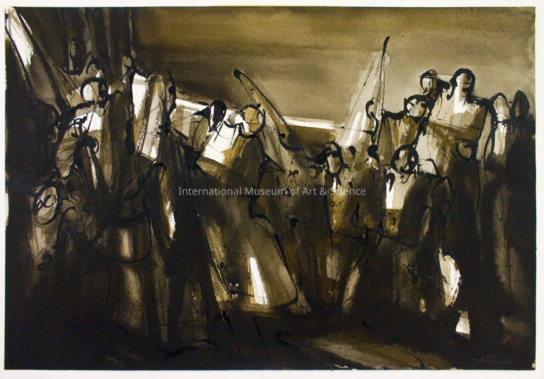"Diabolica Suite - Drawing #3". Line Drawing and watercolor on paper. Depicts a group of people, done in browns, greys, and black.Dimensions