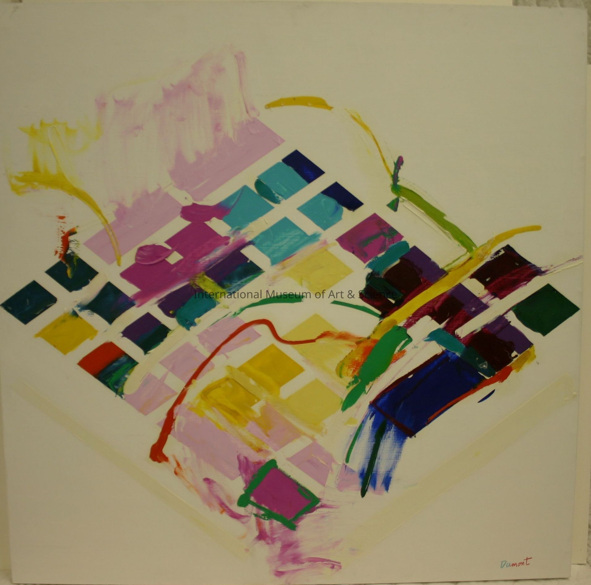 "Diamond Fugue #4" Multicolored diamond shapes on white background.Artwork Details