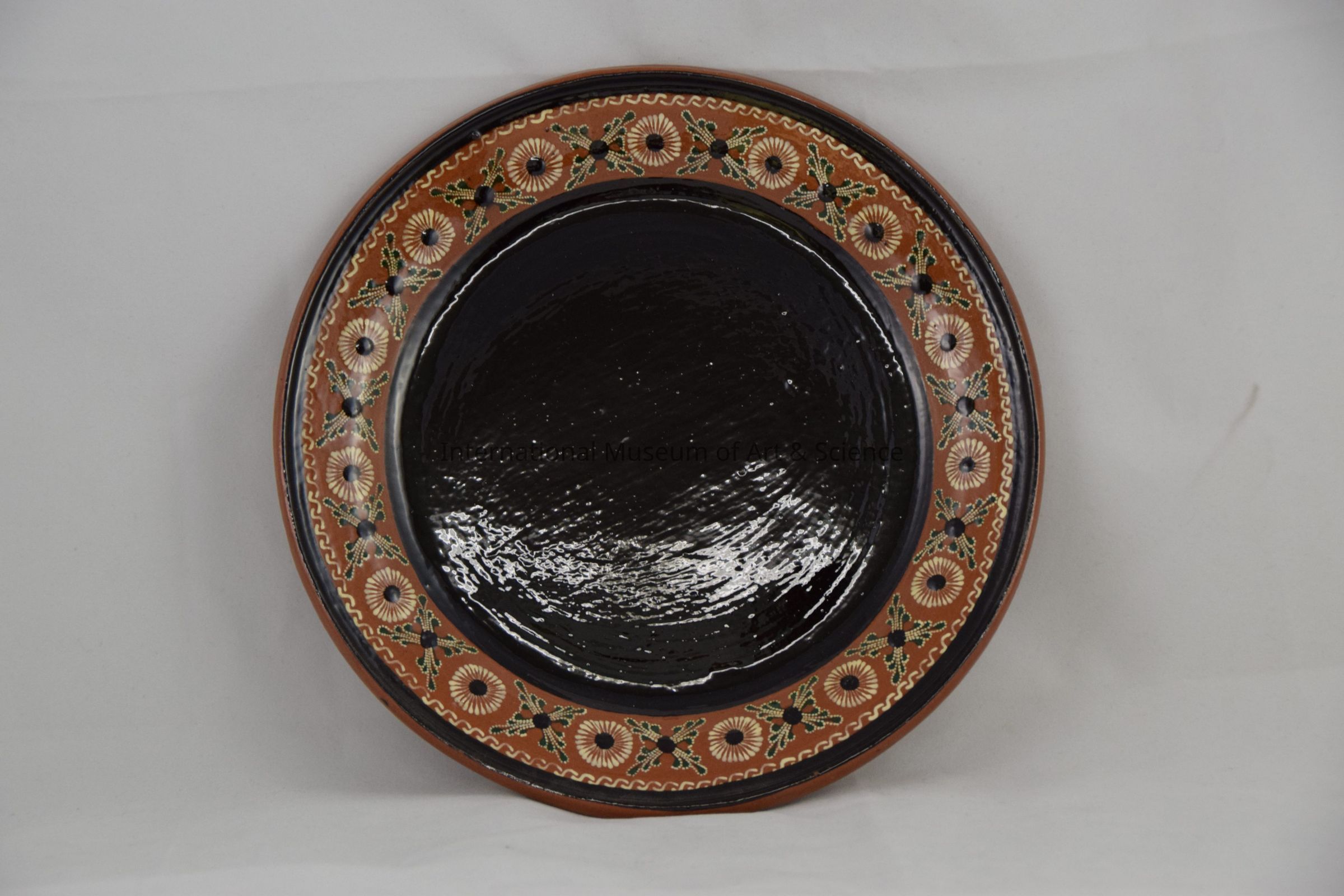 Plate. Capula, Michoacan Mexico. Ladislou Martinez family (Tarascan). Clay, glaze, slip. c. 1986 Plate exterior dark tawny brown; top edge is black followed by cream groove designs; wide brown border decorated with white floral motifs, black dots; geen with cream 'X' designs with black dots; center is black.Made/Created