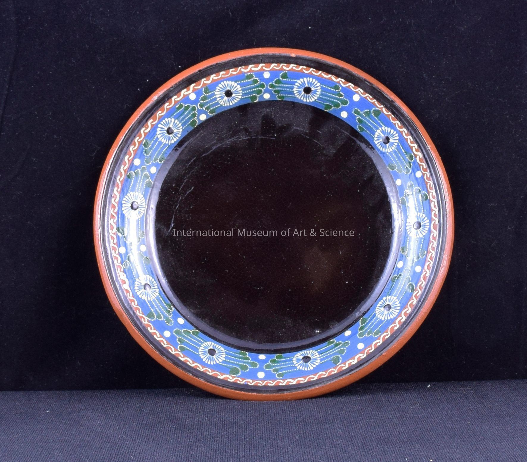 Plate. Capula, Michoacan, Mexico. Ladislou Martinez family (Tarascan). Clay, glaze, slip. c. 1986 Plate with exterior dark tawny brown; black edge on top followed by white groove designs; wide blue band on border decorated with white floral motifs; white; white dots, green leaves; central area plain black.Made/Created