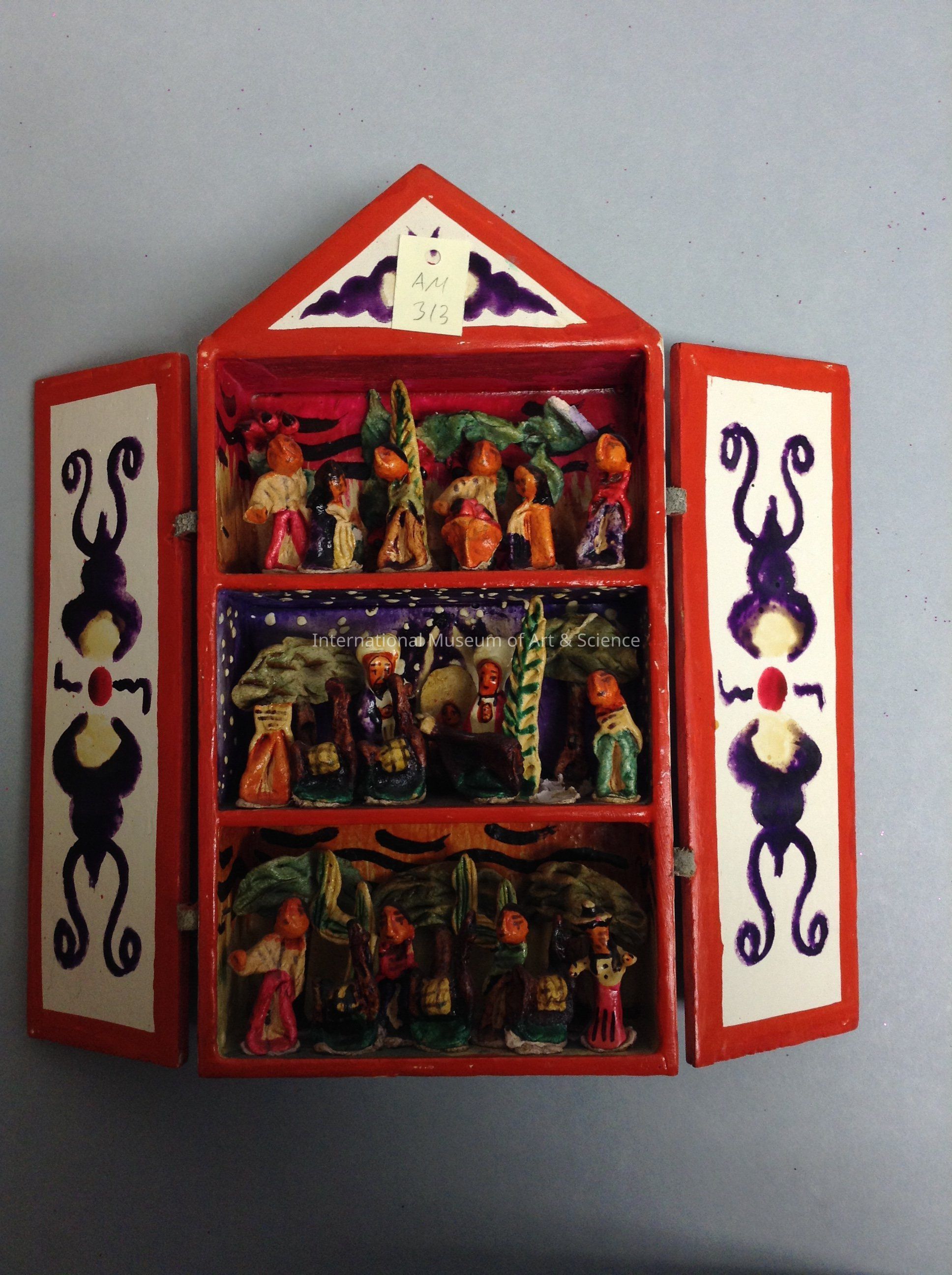 A Peruvian Creche that has two doors that opens up to a three story assemblage. The doors of the Creche has a flower design of pink, green and purple. Jesus can be seen on the top story while the Wisemen are on the second story. The bottom floor consist of animals and other people. At the bottom there's a sticker that reads, "Made in Peru".Artwork Details