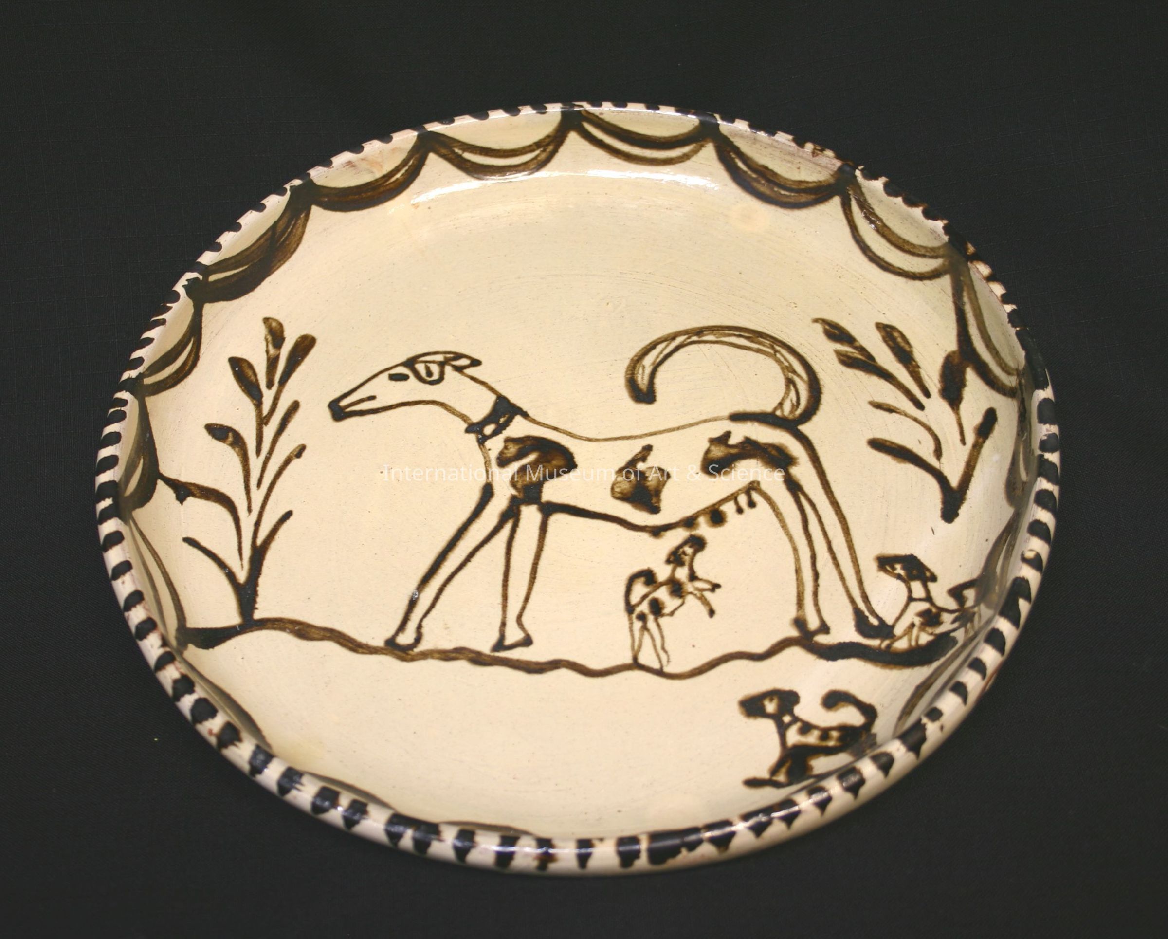 A ceramic plate in white. There is a line and scallop pattern around the edge. In the center is a mother dog nursing her young. Two more puppies stand nearby.Dimensions