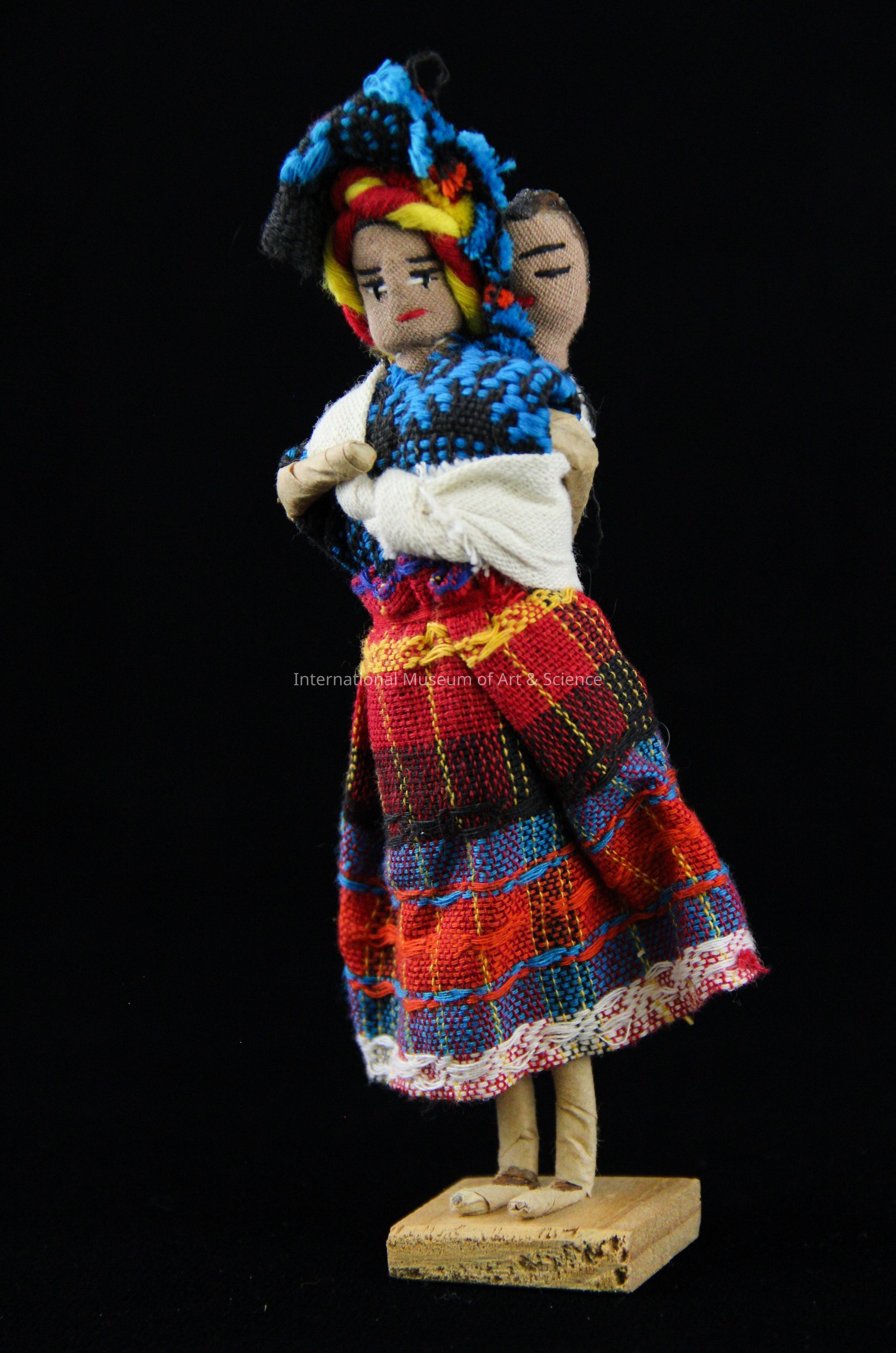 A female doll in traditional Guatemalan dress. The doll is made from paper wrapped around wire with a fabric face. The facial features have been painted on. The doll is wearing a red and yellow braided head covering, a blue and black blouse, a multi-colored plaid cotton skirt, and a white cotton rebozo, with a baby wrapped inside on her back. The doll's feet are attached to a wooden base.Artwork Details