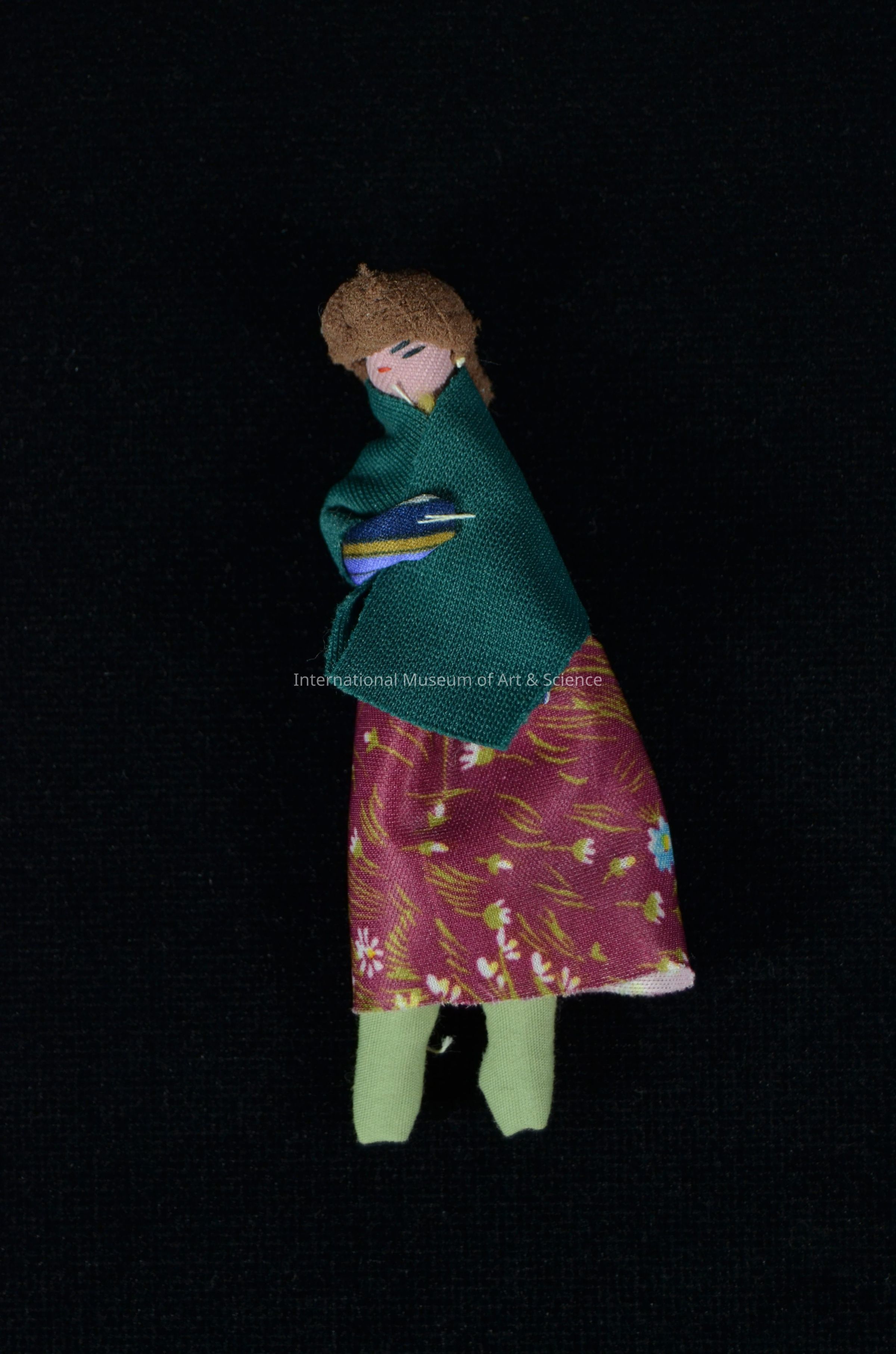 A miniature doll. The doll is wearing a floral dress and a dark green shawl. She has one arm holding the shawl close.Artwork Details