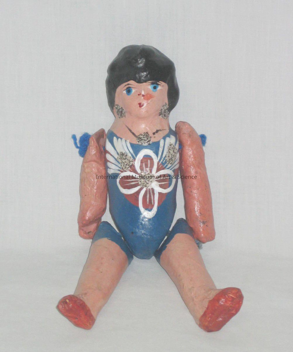A papier-mache doll with movable limbs. The doll is painted with a dark blue leotard and has glitter detailing.