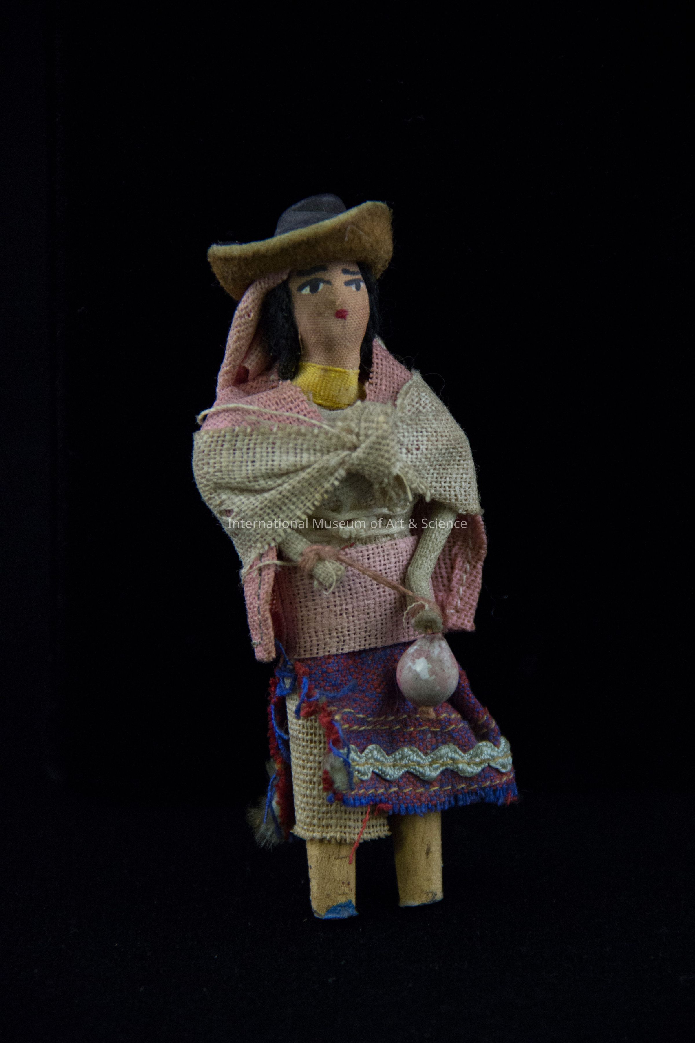 A small doll. The doll is made from wood, fabric, and wire. The doll is wearing a carrying seed pot, a black leather hat, a pink "rebozo", a beige shawl, and a woven skirt with opening on right side.
