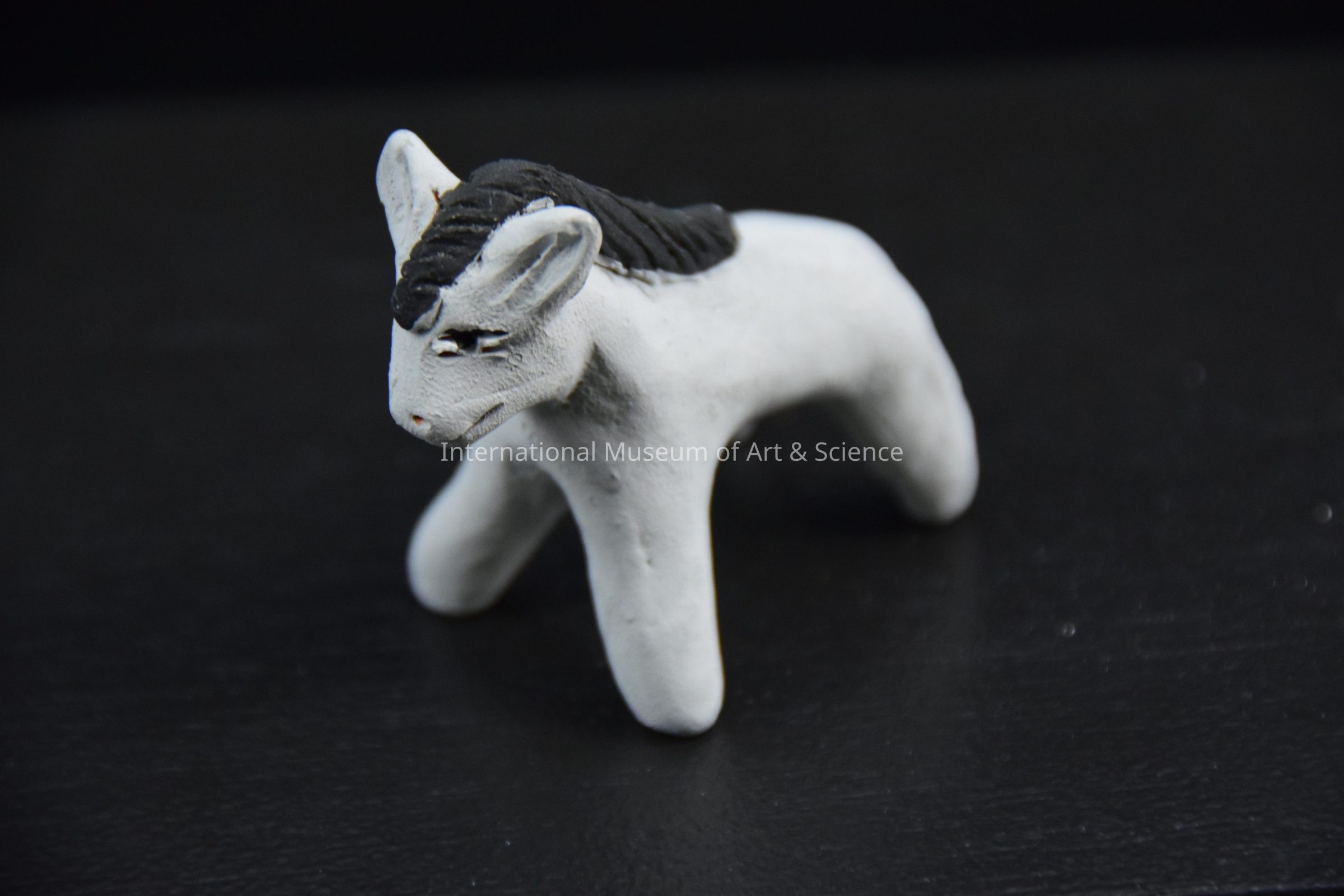 A ceramic figurine of a donkey. The donkey is grey with a black mane. There are three pinholes in the belly. It is part of a 13 piece Nativity scene.Dimensions
