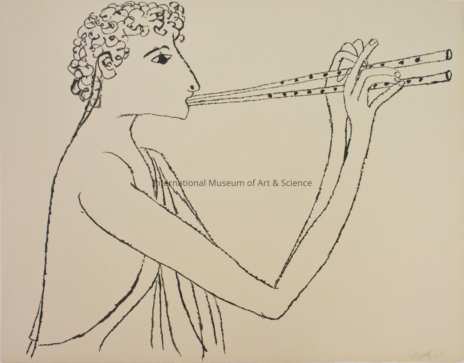 Profiled man facing right plays double flute; figure has curly hair and wears mantle draped over left shoulder; arms very elongated with attenuated hands and fingers, on flute; eye of figure is fronted.Dimensions