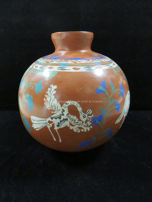 Jug. Red painted clay jug; small mouth and lip; decorative polychrome bands on top and base surround scene showing flora and fauna; birds on opposite face, and rabbit and deer on opposing faces; floral groups separate animal figures; exterior glazed-interior is not.Dimensions