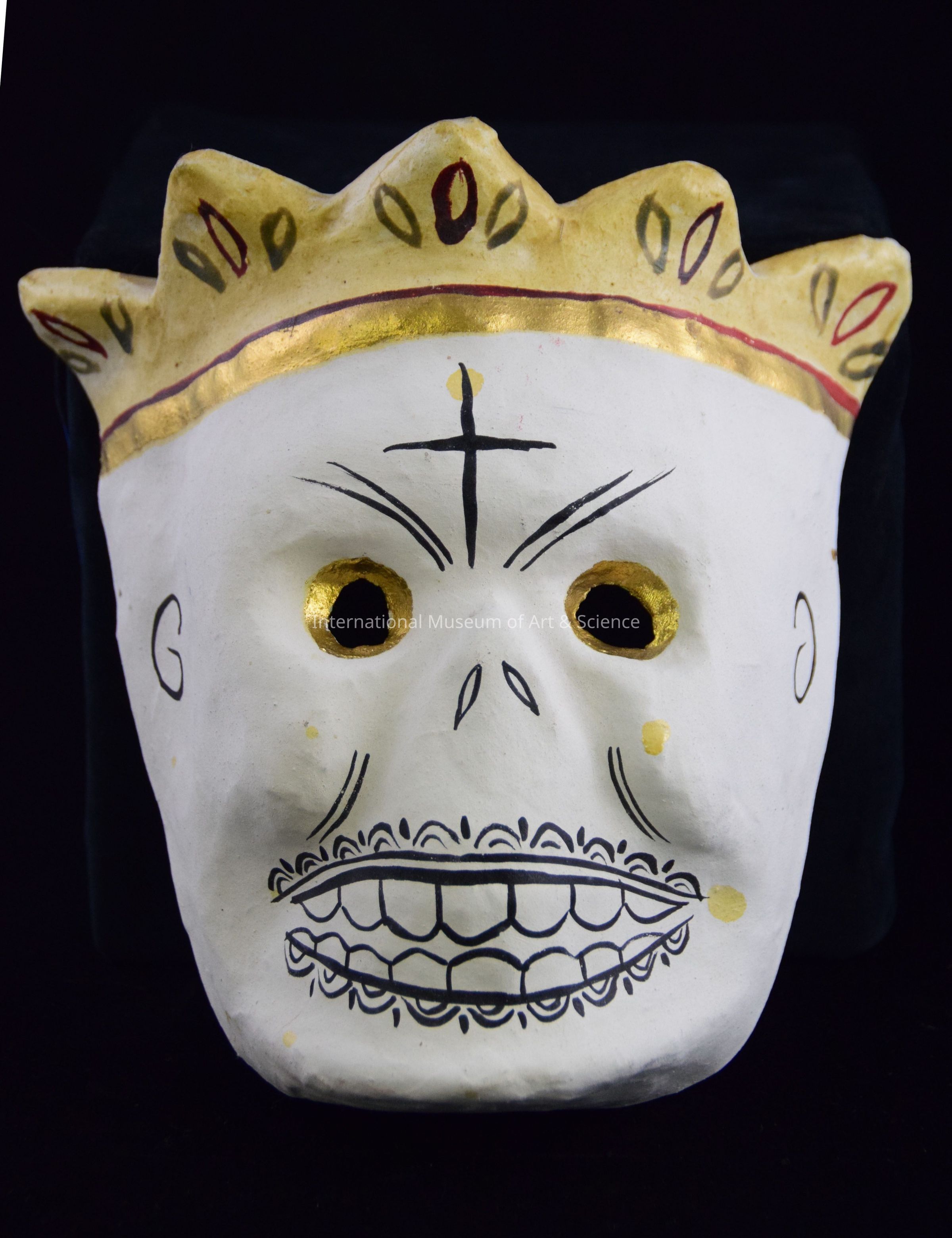 A papier-mache mask. The mask depicts a skeleton king. The face is painted with black detailing. The crown is gold with red and green details. There are holes for eyes, rimmed on gold paint. The mouth is painted on in black.Artwork Details