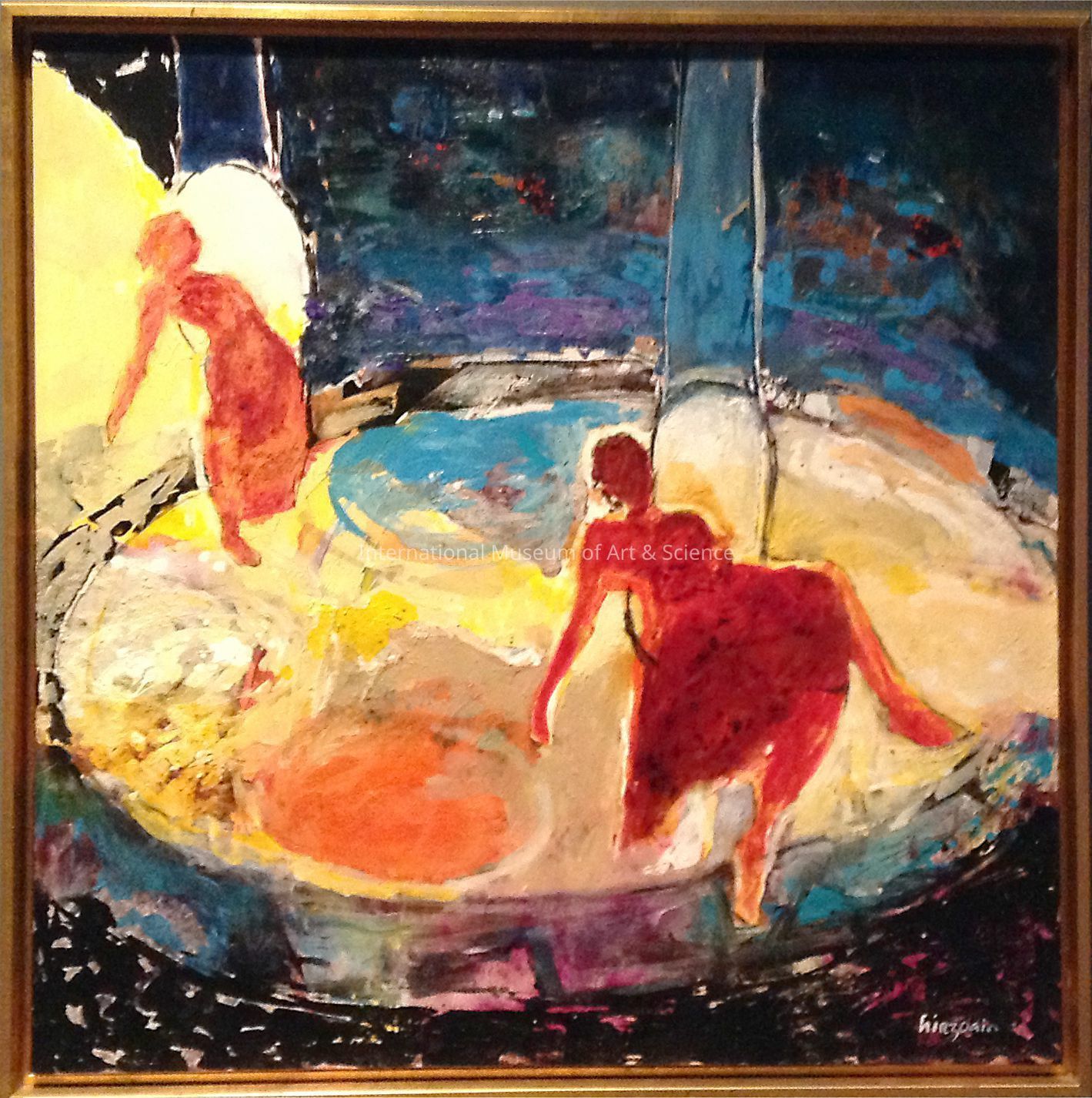 "El Cielo es el Limite". Two red/brown silhouettes each on a trapeze; yellow oval at center suggesting a circus ring; blues and violets in background.Dimensions