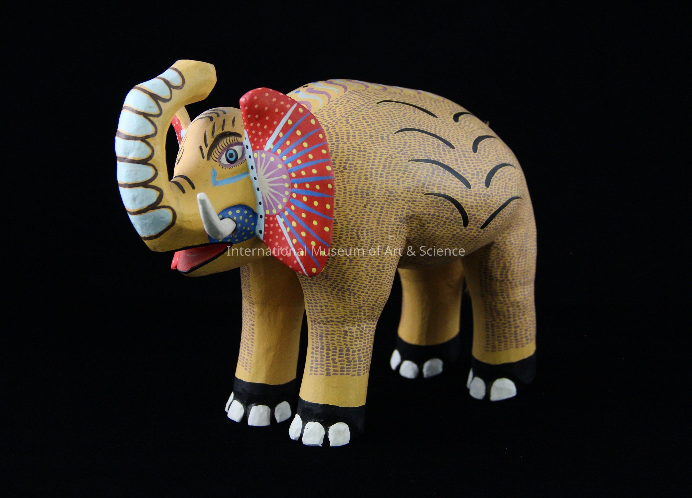 A wood carved figurine of an elephant. The elephant is painted a warm yellow with light-purple, black, and light blue brush strokes that illustrates hair and skin. Its face is detailed with red ears, a pink mouth, blue eyes, and a yellow and blue trunk.Dimensions