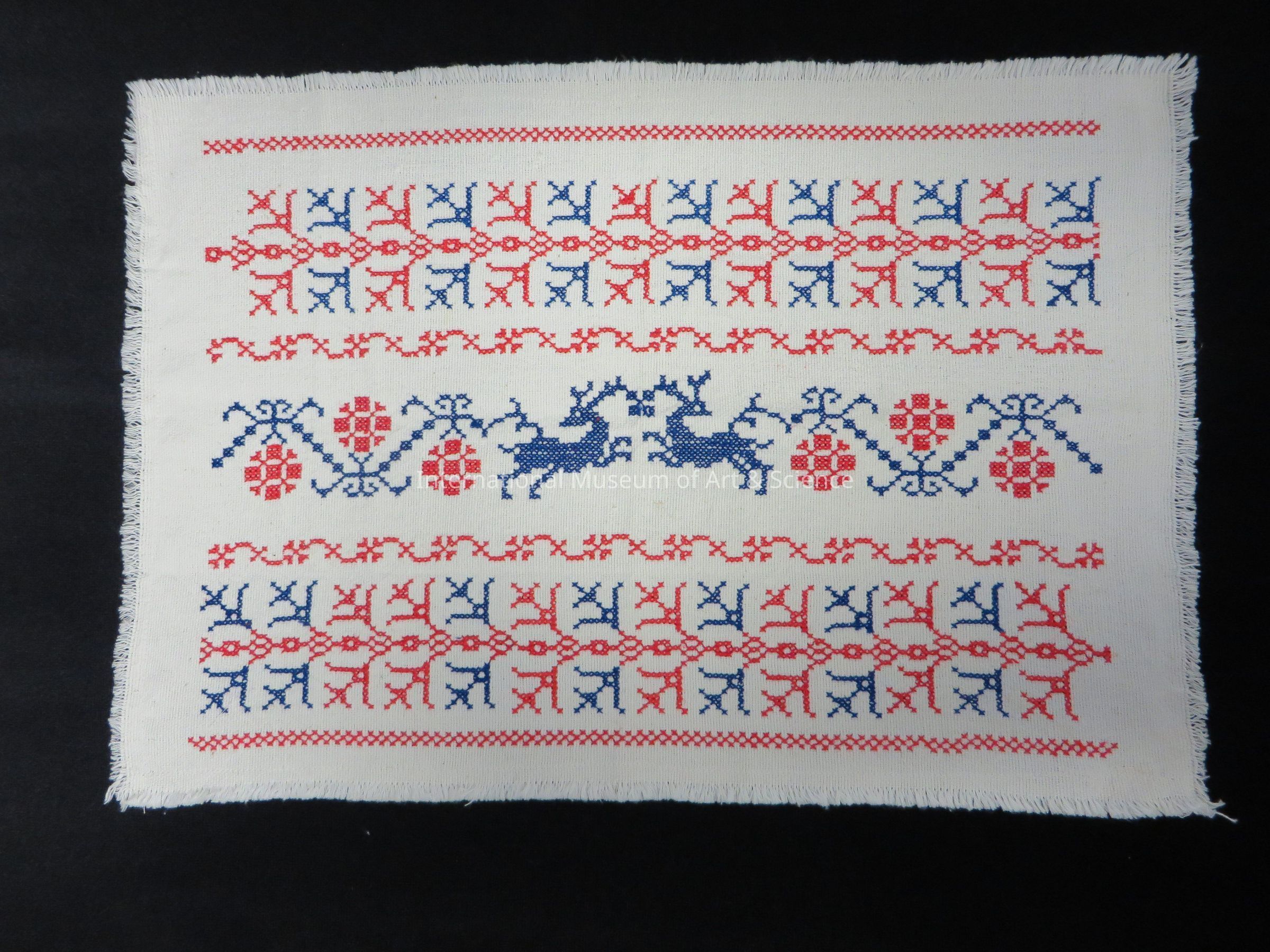 Fabric; embroidered cloth in cross-stitch red and blue on white showing deer and flowers, typical style from Patzcuaro, Michoacan, MexicoDimensions