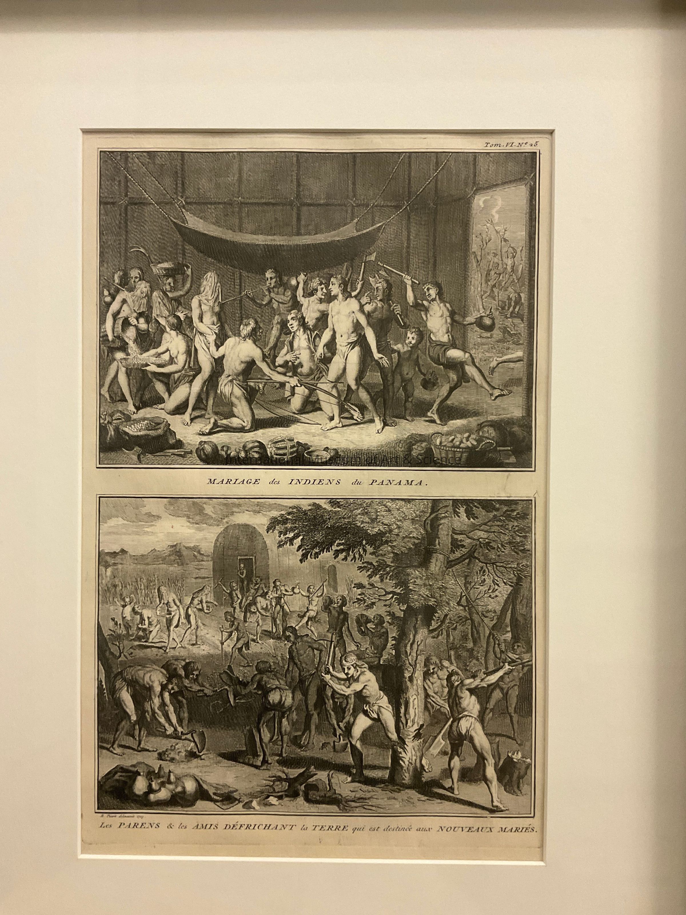 Top view titled, "Mariage des Indiens du Panama". Depicts villagers with small amount of clothing inside a barrack; large hammock hanging to one side; three women have veils over their faces; men with axes, bows and arrows, pipes; women carrying or pouring grain into baskets; baskets and bags of fruit and vegetables on the floor; doorway shows villagers outside chopping wood with axes; few bare trees.