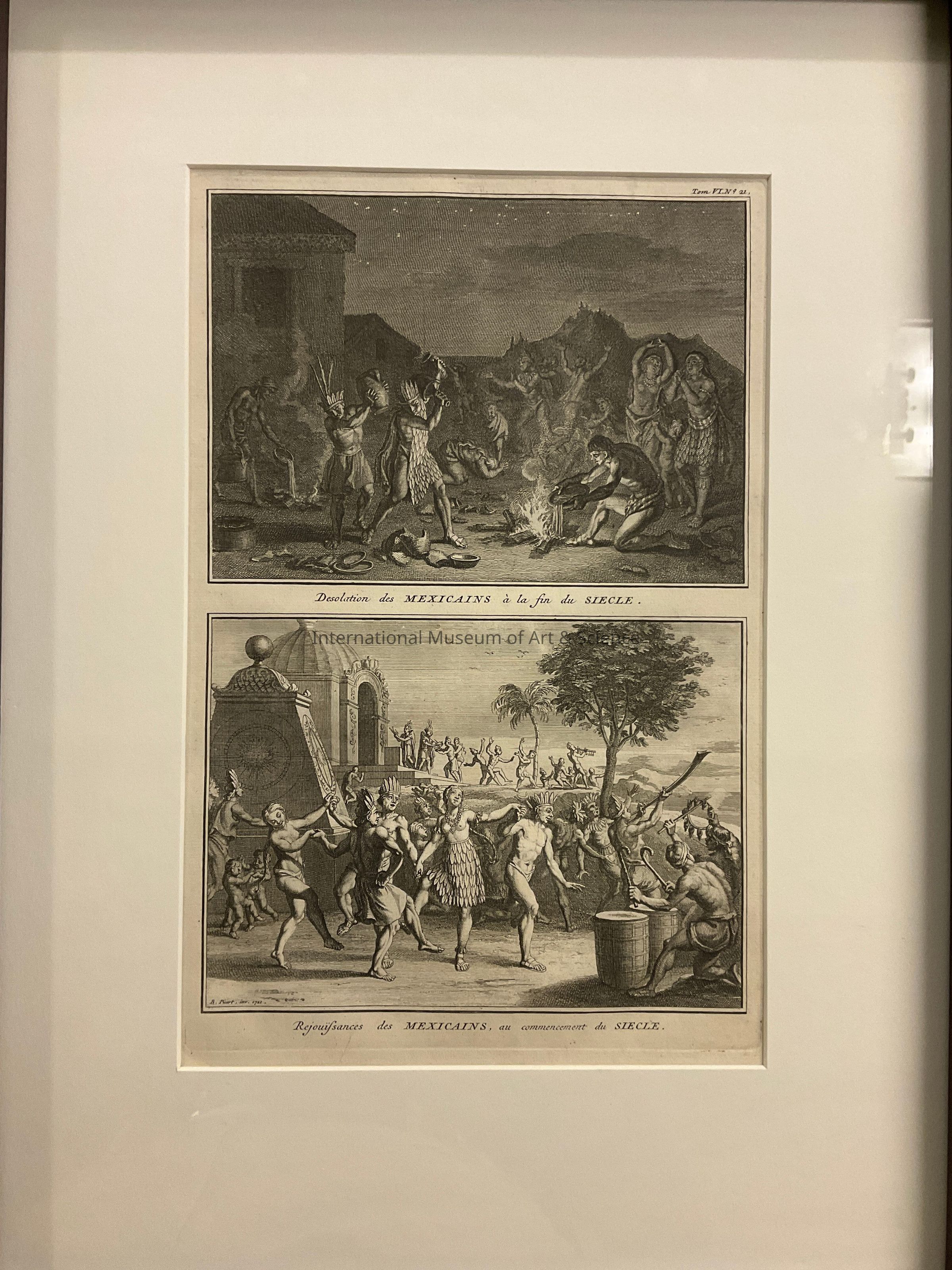 Bottom view titled, "Rejouisances des Mexicains, au Commencement du Siecle". (Translation, "Rejoicing of the Mexicans at the Beginning of the Age".) Depicts villagers dancing, and apparently to be happy. They are on two levels. Those in the front of the view are on a lower level. There is a woman in a feather or leaf skirt with beads around her neck dancing with three other men and a mostly nude woman. They are holding hands. There are two children dancing in the bottom left corner. In the bottom right corner is a man playing two drums with curved sticks, another with a tambourine-like instrument, and one playing a horn. Behind all these people is a rise in the land. There is a tree on the right. On the land behind the tree are more villagers dancing, one playing some kind of pipe. On the left side is a building, possibly a temple, with an arched doorway. There is a palm tree; birds flying in the sky; two men near the temple door who could be priests.Artwork Details
