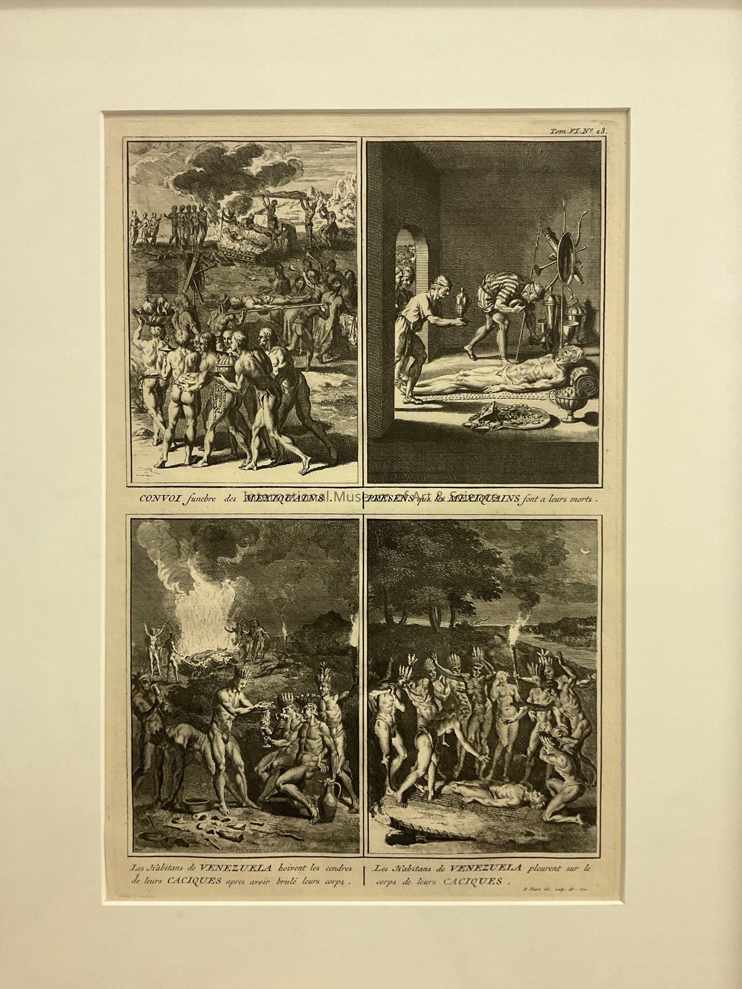Bottom left view titled, "Les Habitans de Venezuela Boivent les Cendres de Leurs Caciques Apes Avoir Brule Leurs Corps". (Translation, "The Inhabitants of Venezuela Drink the Ashes of Their 'Cacignes' After Burning Their Corpses". Depicts men putting possibly ashes from the ground into goblets and other receptacles (six men with headdresses of either leaves or feathers, one on far right carrying torch). Various objects on ground in front of them. Bed of fire in background with body on it. Men standing with their arms raised around fire; one sitting holding torch; clouds of smoke rising. Mountain visible in distance.