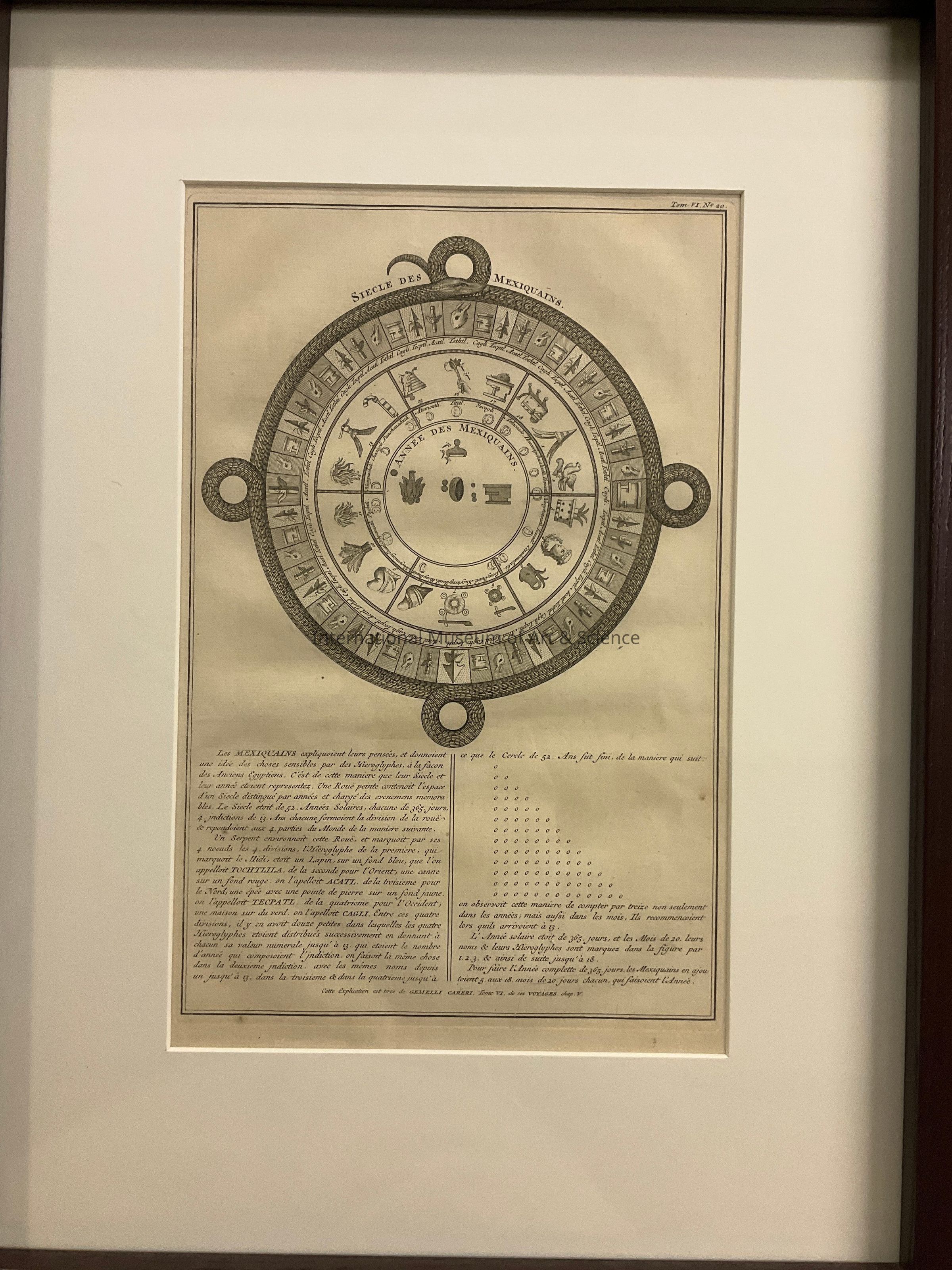 Title on top of circle, "Siecle Des Mexiqains". Title inside of innermost circle, "Annee des Mexiqains". This seems to be an engraving of a calendar. It is circular, with and outer border in the form of a snake. Its head and tail are at the top. At the top and bottom, and on both sides (directly opposite from each other) are loops going all the way around the circle. There are four symbols, shich are repeated. In the next circle is writing. Four words are repeated, each word with a period after it. The next circle is divided into six sections, with three symbols in each. The symbols are numbered from one to eighteen. The next circle is divided into six sections also, with what appear to be different phases of the moon at different places. The innermost circle, (the center) has written, "Annee des Mexiquains" and has different pictures in it. This calendar is on the top half of the engraving. The bottom half is writing. It seems to be an explanation of the calendar. It is divided into two columns by a double line. On the right side is a triangular-shaped arrangement of small circles. The is one sentence written across the bottom of the explanation.Dimensions