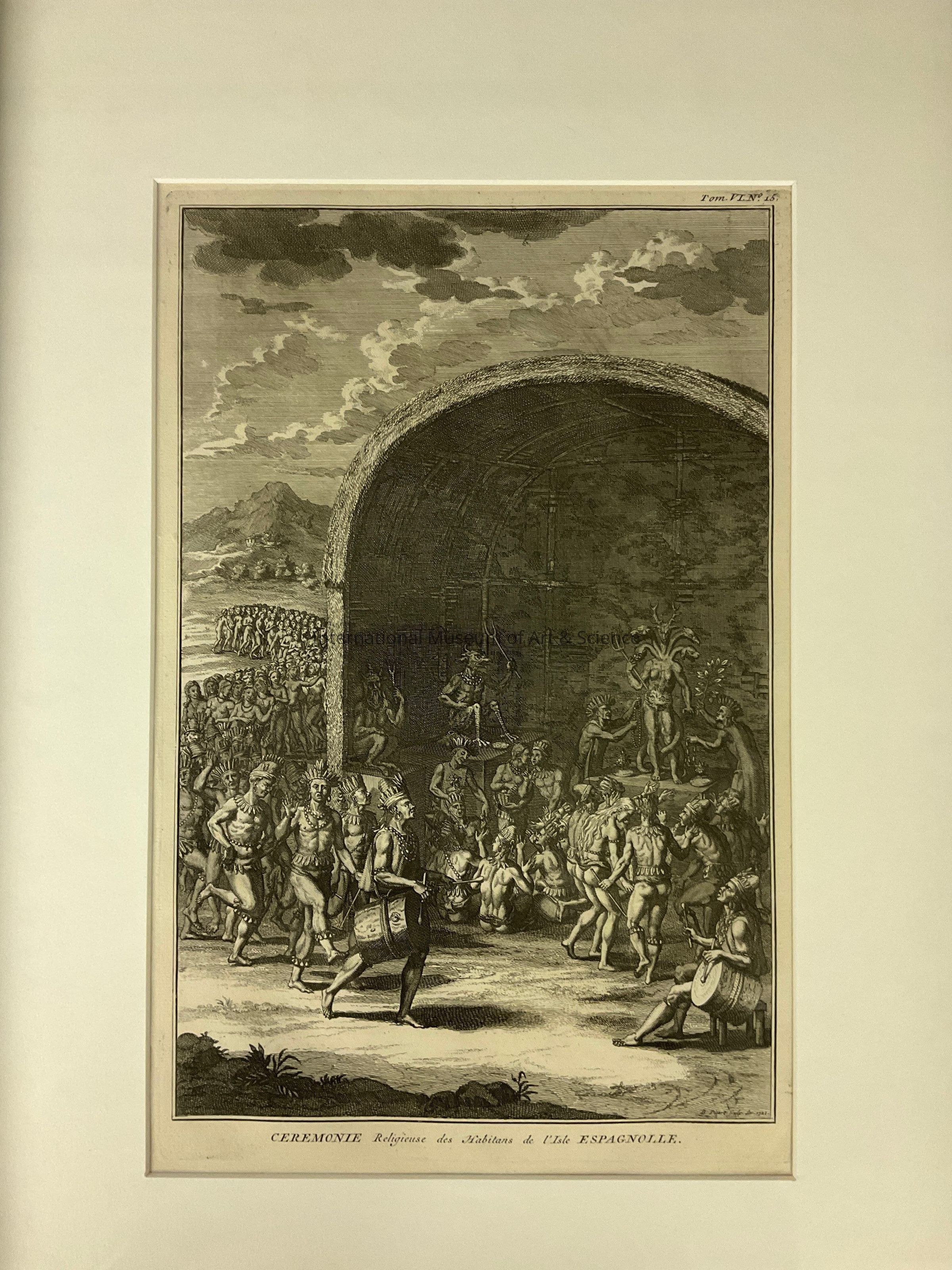 View titled, "Ceremonie Religieuse des Habitans de l'Isle Espagnolle". (Translation, "Religious Ceremony of the Inhabitants of the Island of Espagnolle (Hispaniola?)".) Depicts a cery large dome-roofed structure. The beams that held it together are visible on the inside. Inside walls appear to have some kind of design on them. Inside the sturucture are three statues or figures. The one on the far left is the figure of a man with a beard and hat with several protrusions holding a two-pronged spear in his left hand. The next figure has bird legs and feet, and a man's upper body. It has a half-bird, half-animal head with ears and horns like a cow. Its right hand is on its stomach and in its left hand it holds a two-pronged spear. The third figure has five heads, the middle like a deer with antlers. It holds a three-pronged spear in its right hand. Covering its stomach is the face of a bird. A thick snake (or tail?) is curled around its legs. Men in headdresses stand on each side of this figure. The one on the left is about to hang a necklace on the figure. The one on the right holds a branch with leaves and a necklace. Both men wear capes. All three statues are on platforms. Coming from the left and going around to the front of the structure is a procession of people, about four people wide. The front part of the procession is made up of men in headdresses, various different types of necklaces and arm and leg bands. The first man plays a drum. The rest, and largest part of the procession is of semi-nude women. Behind them, mountains with trees, and one small building are visible. Directly in front of the structure containing the statues, many people, both men and women are gathered. At the left, men sit in a circle on the floor. At the right, men are standing with one woman with long hair. At the far right, a man sits on a square stool playing a drum.Dimensions