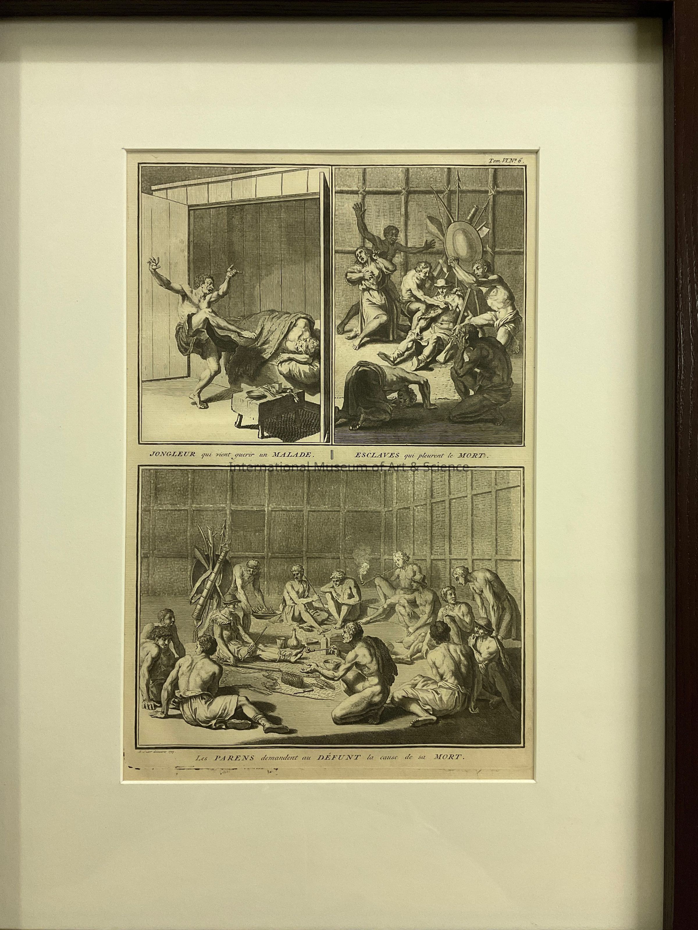 Bottom view titled, "Les Parens Demandent au Defunt la Cause se sa Mort". (Translation, "The Relatives Ask the Deceased the Cause of his Death".) Depicts fourteen male figures seated or standing in a circle; four figures with smoke pipes, others in conversation; one serving a dish to a man wearing a hat and weapons behind him.Dimensions