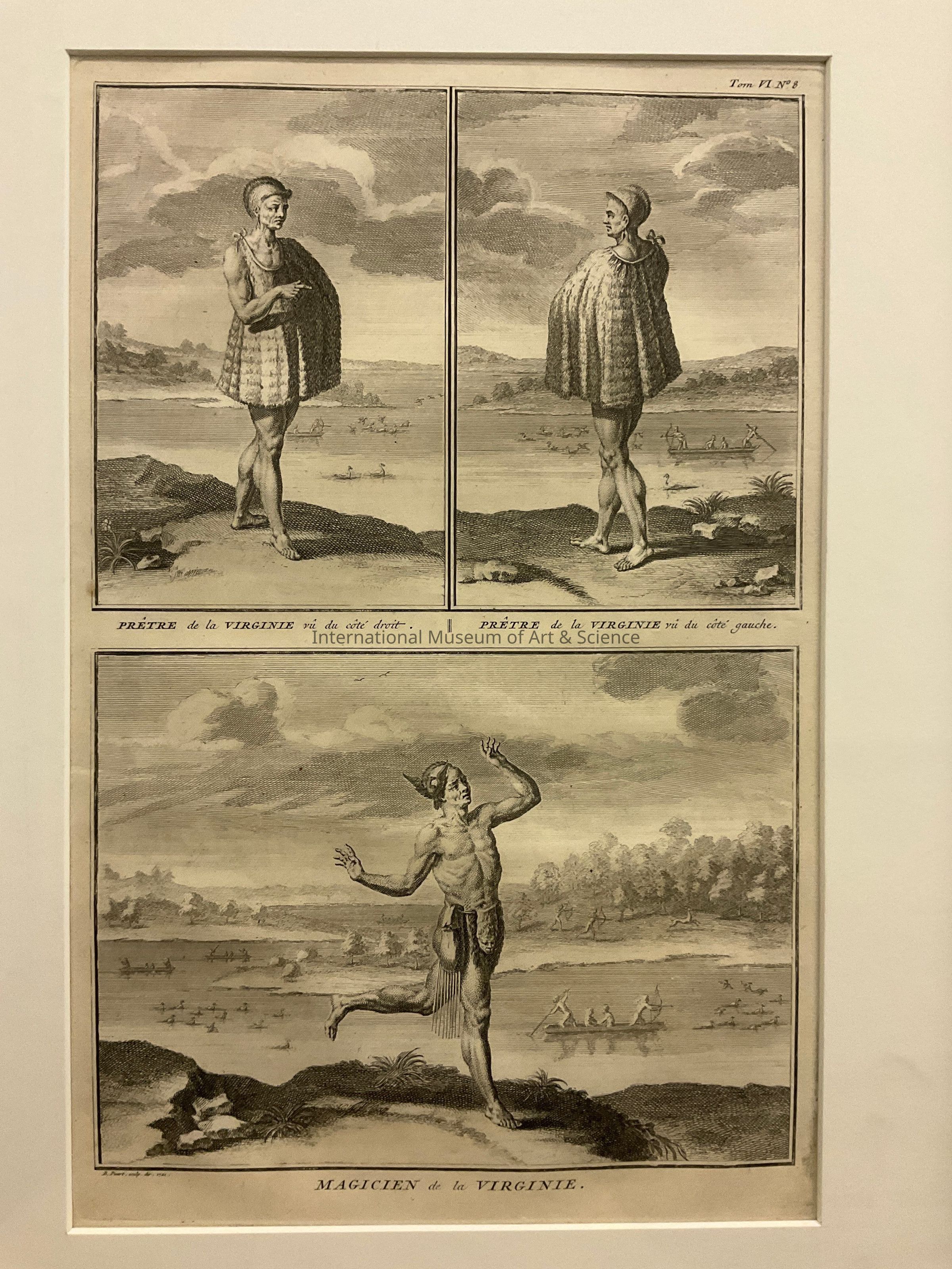 Bottom view titled, "Magicien de la Virginie". (Translation, "Sorcerer of Virginia".) Depicts male figure in dancing position or pose; mohawk hair, eagle above his right ear; wearing a waist bag with tassels, fur animal's head mid section; standing on a river edge; background depicts canoers with bow and arrows, swans on the river; bow hunters after a deer, tree forest.Dimensions