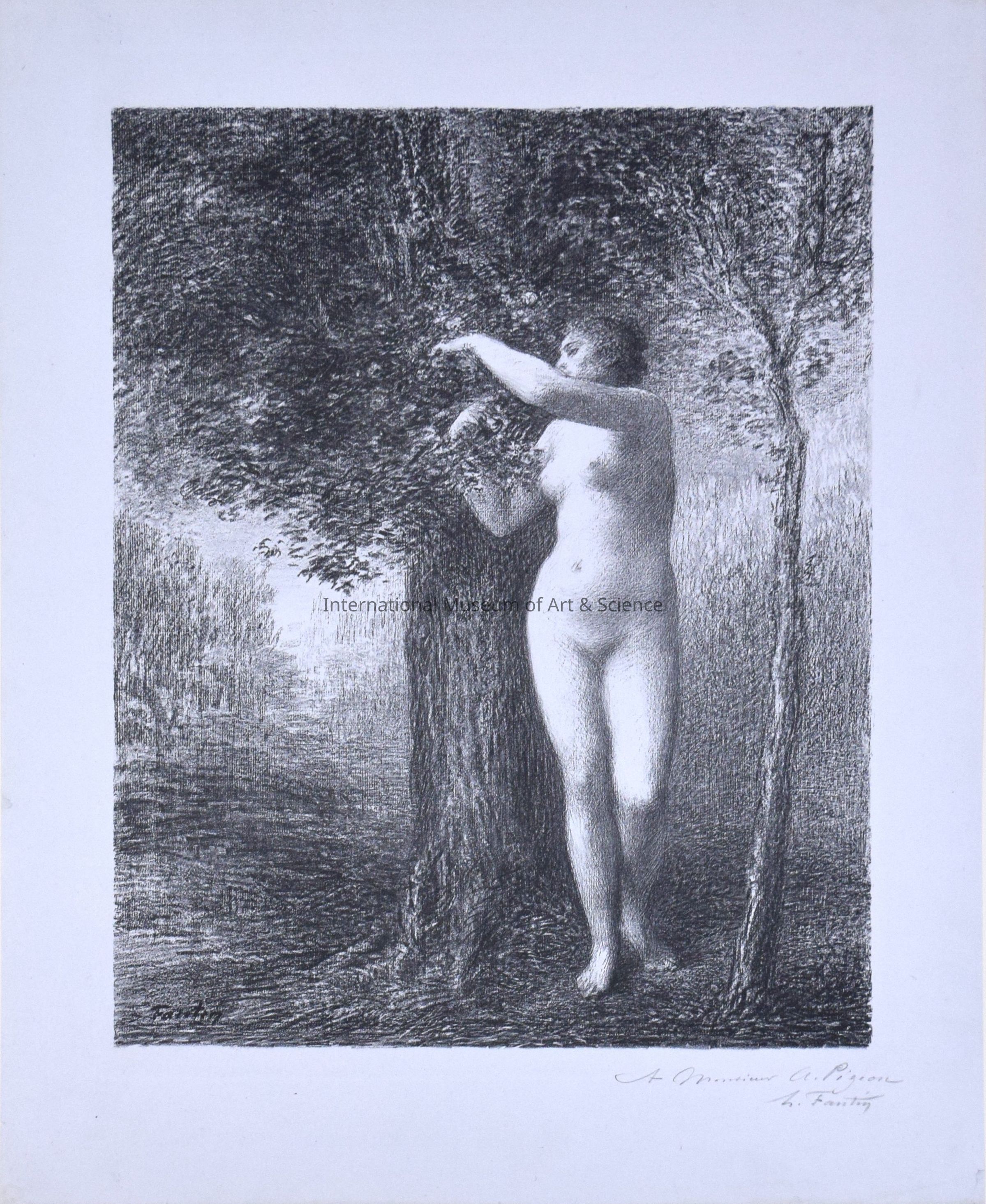A lithograph by Henri Fantin-Latour made on Chine volant. This print is titled as "Eve". It is a picture of a naked woman depicted as the biblical "Eve" next to a tree that is bearing fruit. This print is dedicated to "A Monseiur A. Pigeon" and signed on the proper lower right.Made/Created