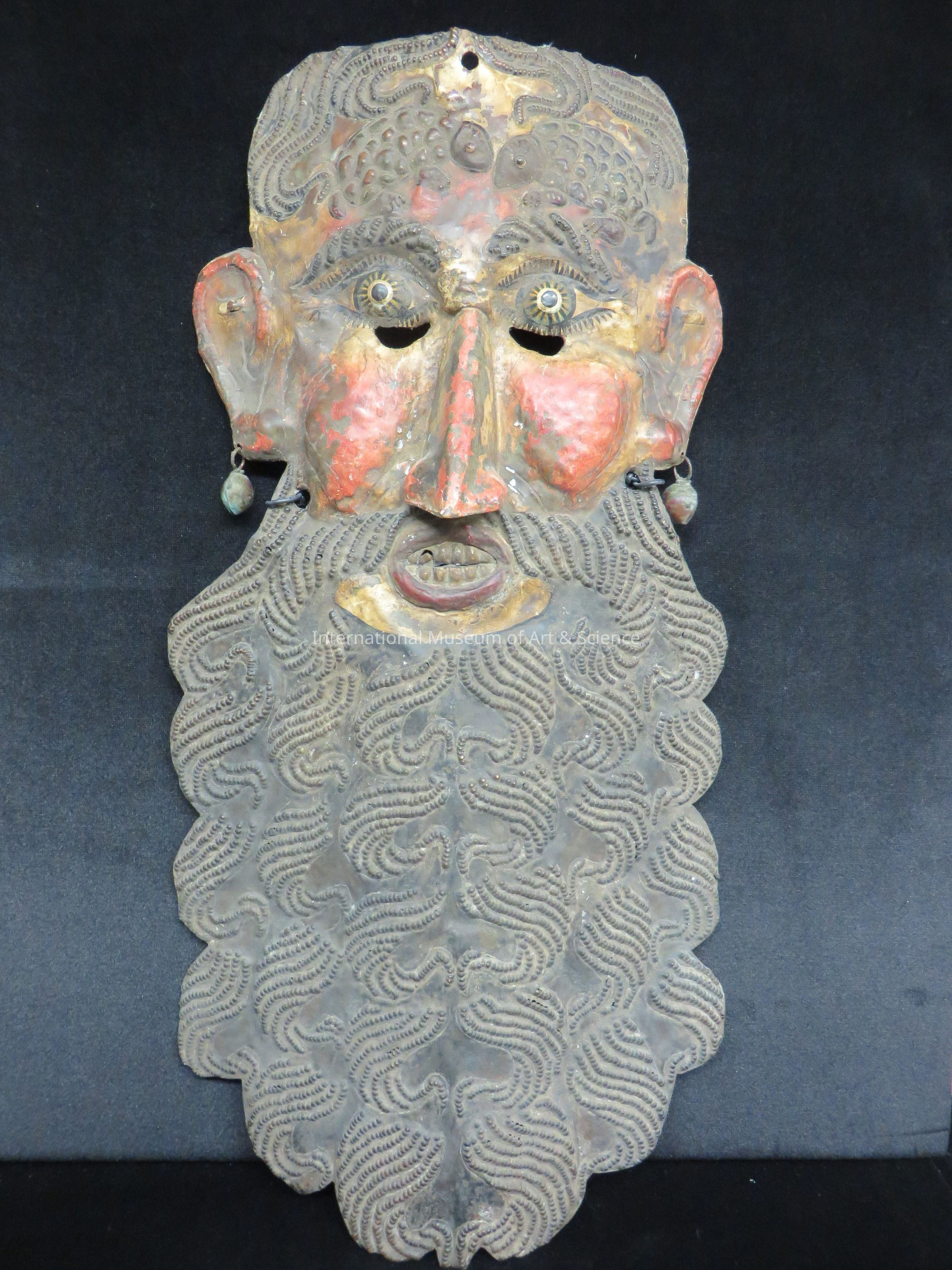 Face panel. Long face panel representing the Bearded man; a pair of armadillos repoussed on the forehead. Interior is not cloth-lined; design of a human face with small eyes, heavy black brows, red face and oval red mouth exposing teeth; large red ears, with small round sheet copper bells in the lobes; flat top, lines of black hair, short; long, black, repoussed beard with scalloped edges; sharp prominent nose soldered to the surface; small chin cup soldered on back.