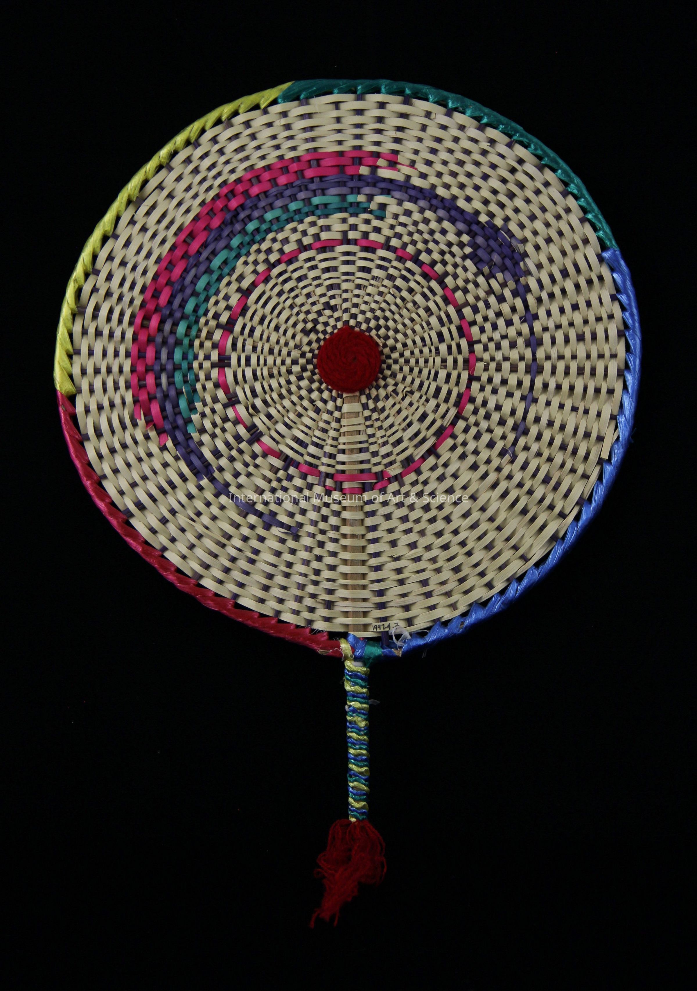 A round fan. It is constructed of radiating sticks through which are woven, in a basket fashion, with flat strips of plant materials. The edge is finished in braided plastic. The handle extends from center. The exposed portion of handle plastic-wrapped. There is a yarn tassle on the handle. The center is decorated with round, yarn-covered "buttons."