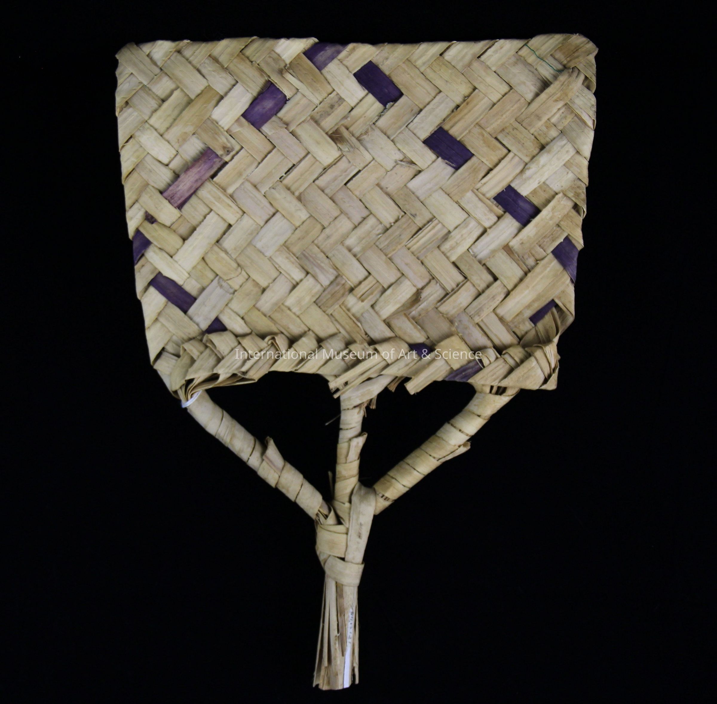 A rectangular, woven fan. The fan is woven from dried agave leaves. Some of the leaves have been dyed purple.