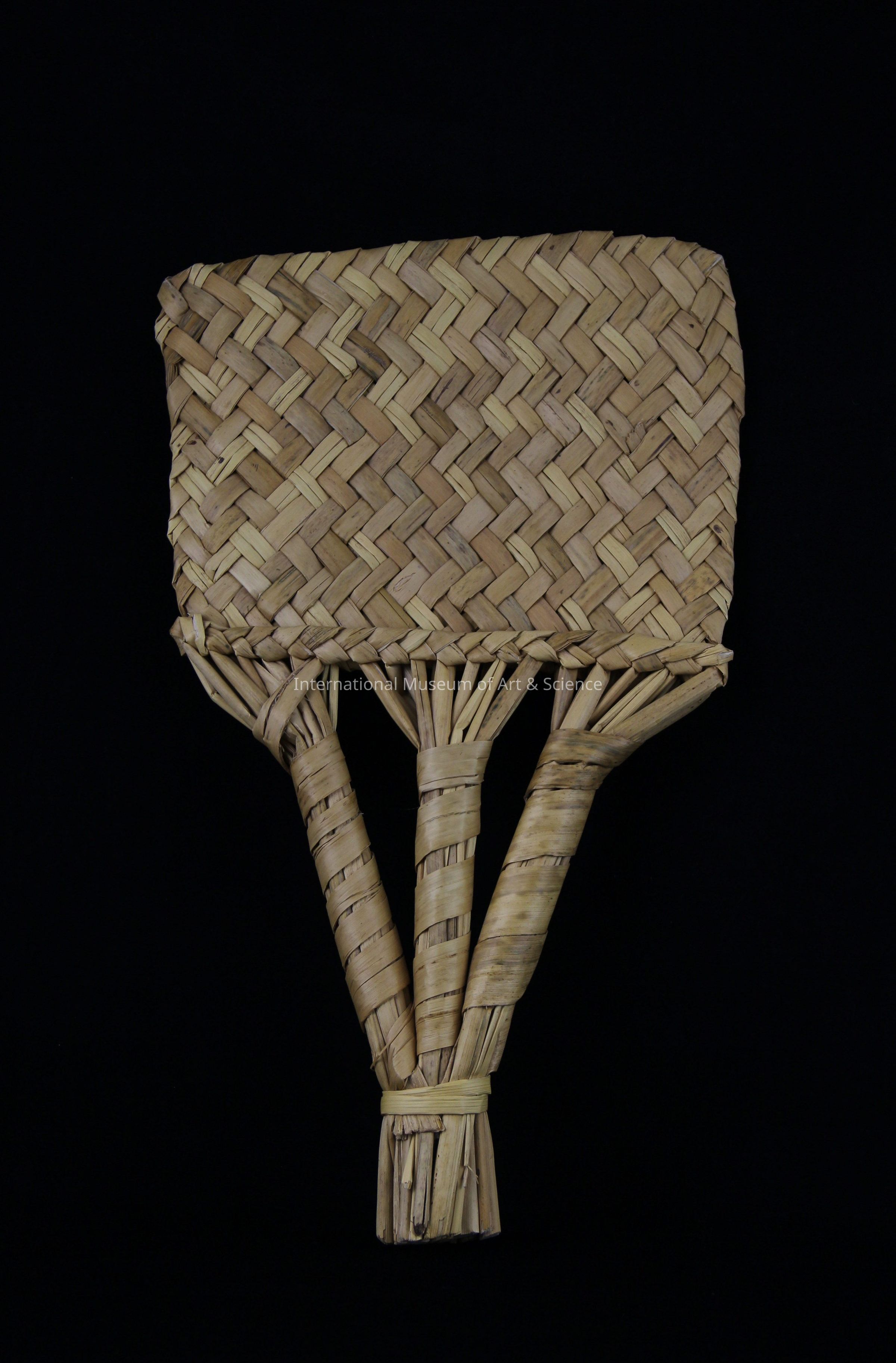 A hat fan made of tule water reed leaves. The fan has a square woven body with triple wrapped handle. The piece has natural green and beige leaves.Dimensions
