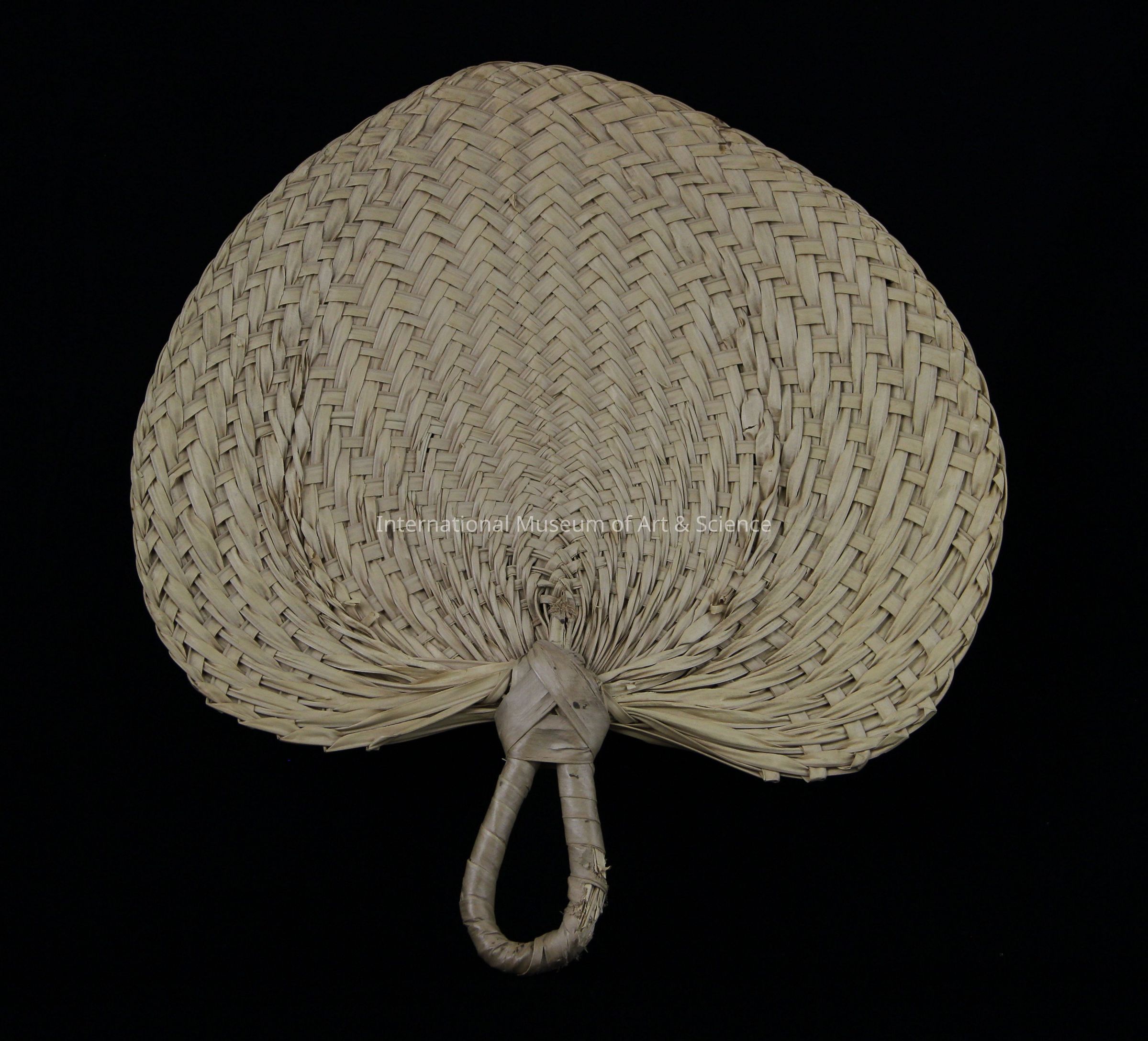 A woven fan made from natural palm fronds. The fan is in the shape of a leaf. This trype of fan would be used in the tortilla making process.