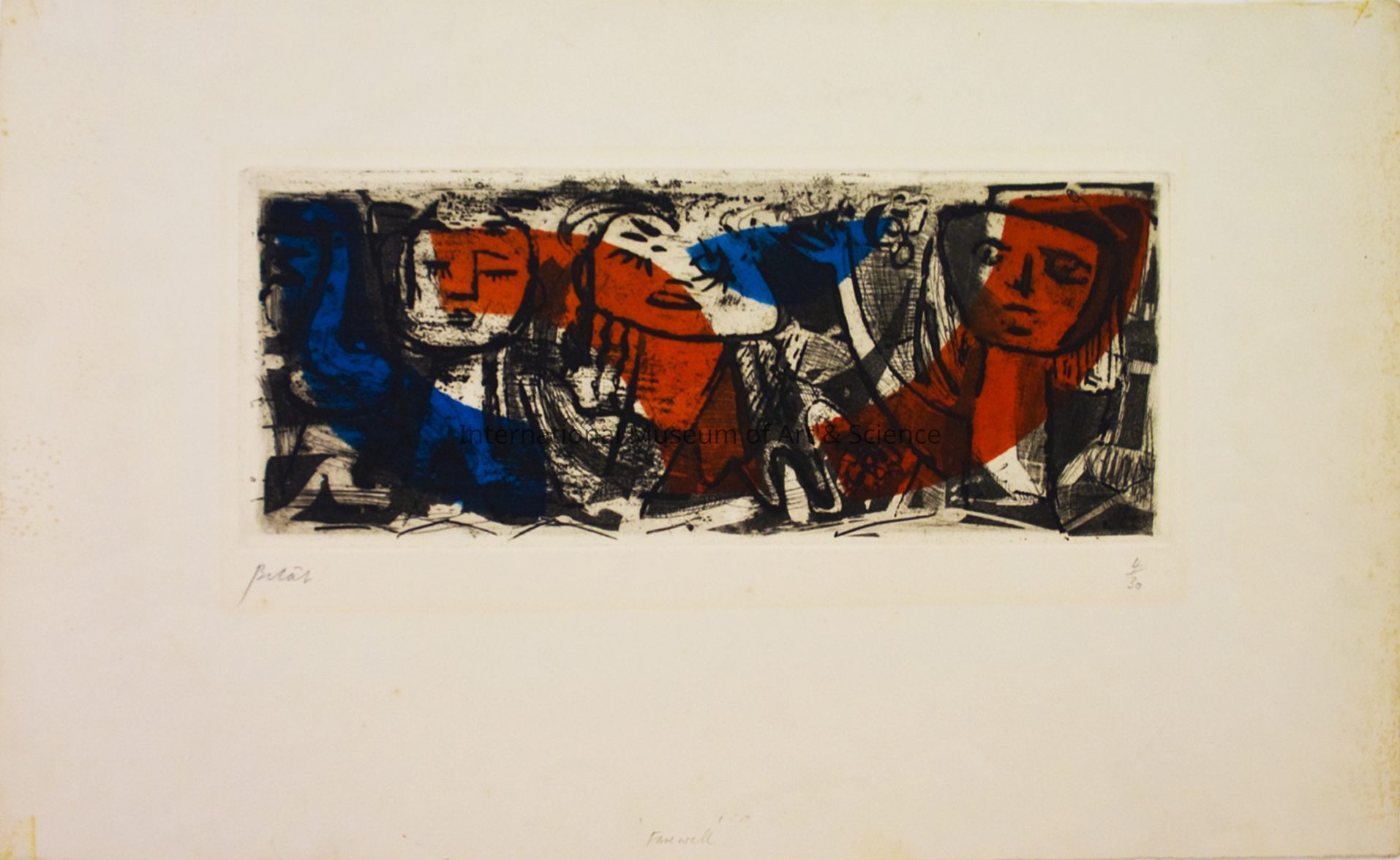 Three figures in black with red and blue shapes superimposed. Etching, signed, #4 of edition 30.