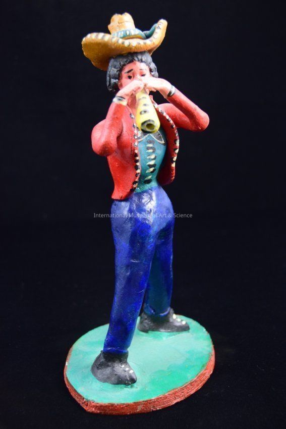 A ceramic figurine of a man. He is wearing an teal shirt, blue pants, a red striped cape, a red jacket, and a cowboy hat. He is holding a yellow horn instrument up to his mouth with both hands. The figure stands on a red and green base He is part of a group of figurines.Artwork Details