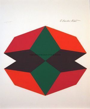 "February". Octagon form; two dark green diamond shapes at center; middle section is deep purple; two diagonal rhomboid shapes at the top and bottom of bright orange and red-violet; white background; 119/125.Made/Created