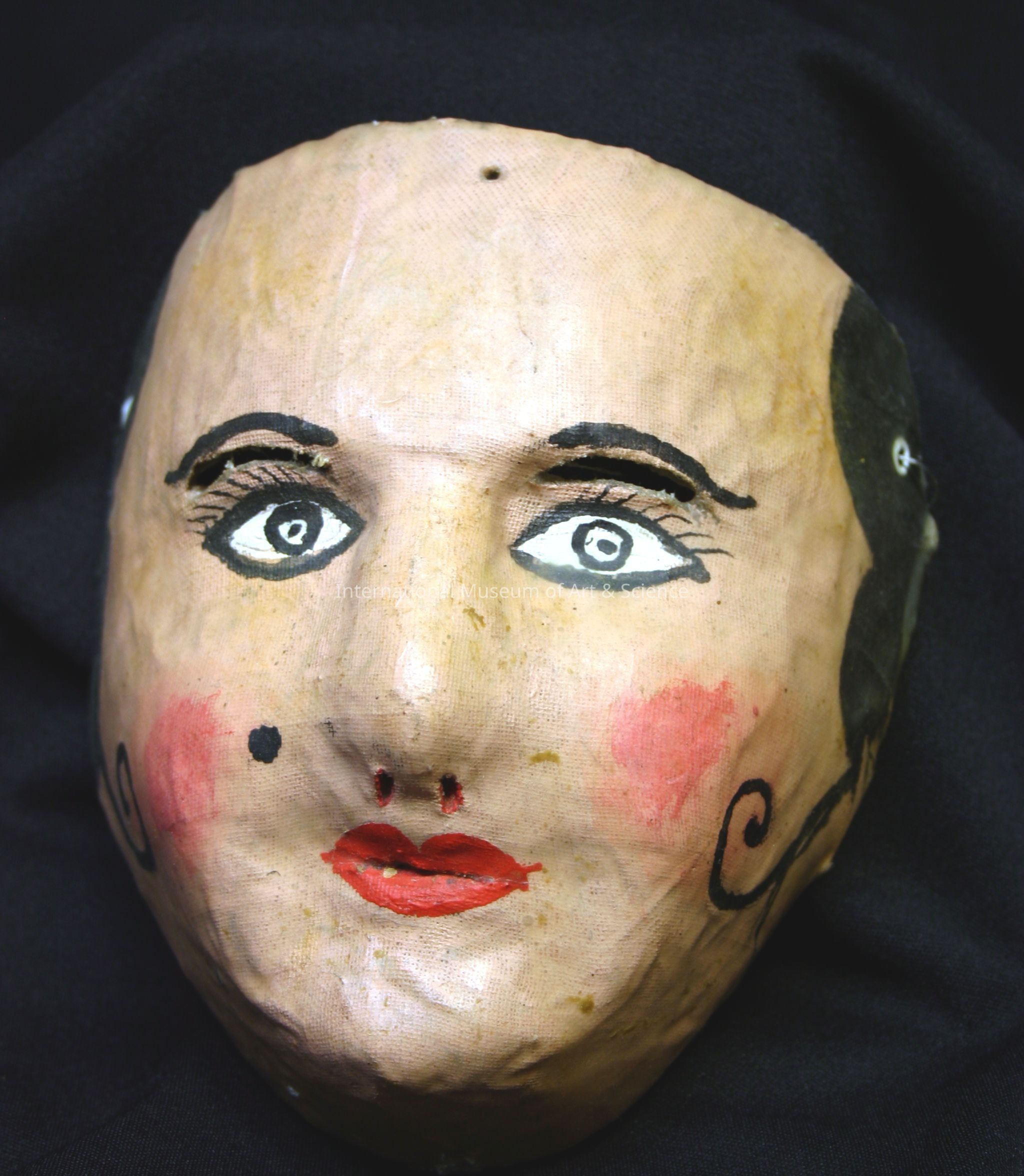 Jardineros Dance Mask. Female mask; tannish skin; protruded nose; red lips, blushed cheeks; black hair and eyebrows.
