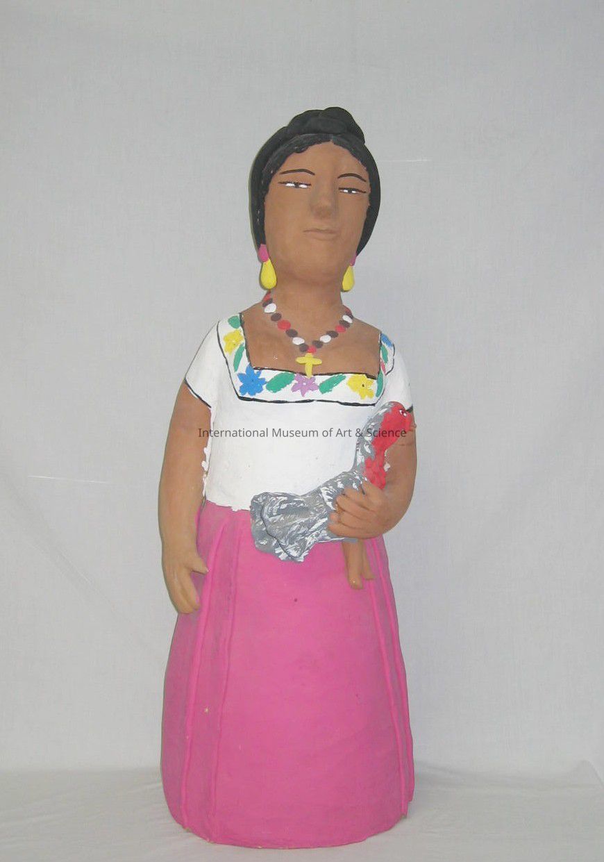 A tall ceramic figurine/sculpture of a woman standing. The figure has a medium brown skin tone with a black rosette hairstyle. She is styled with a white blouse and a pink skirt. In her left arm she holds a turkey (removable).Dimensions
