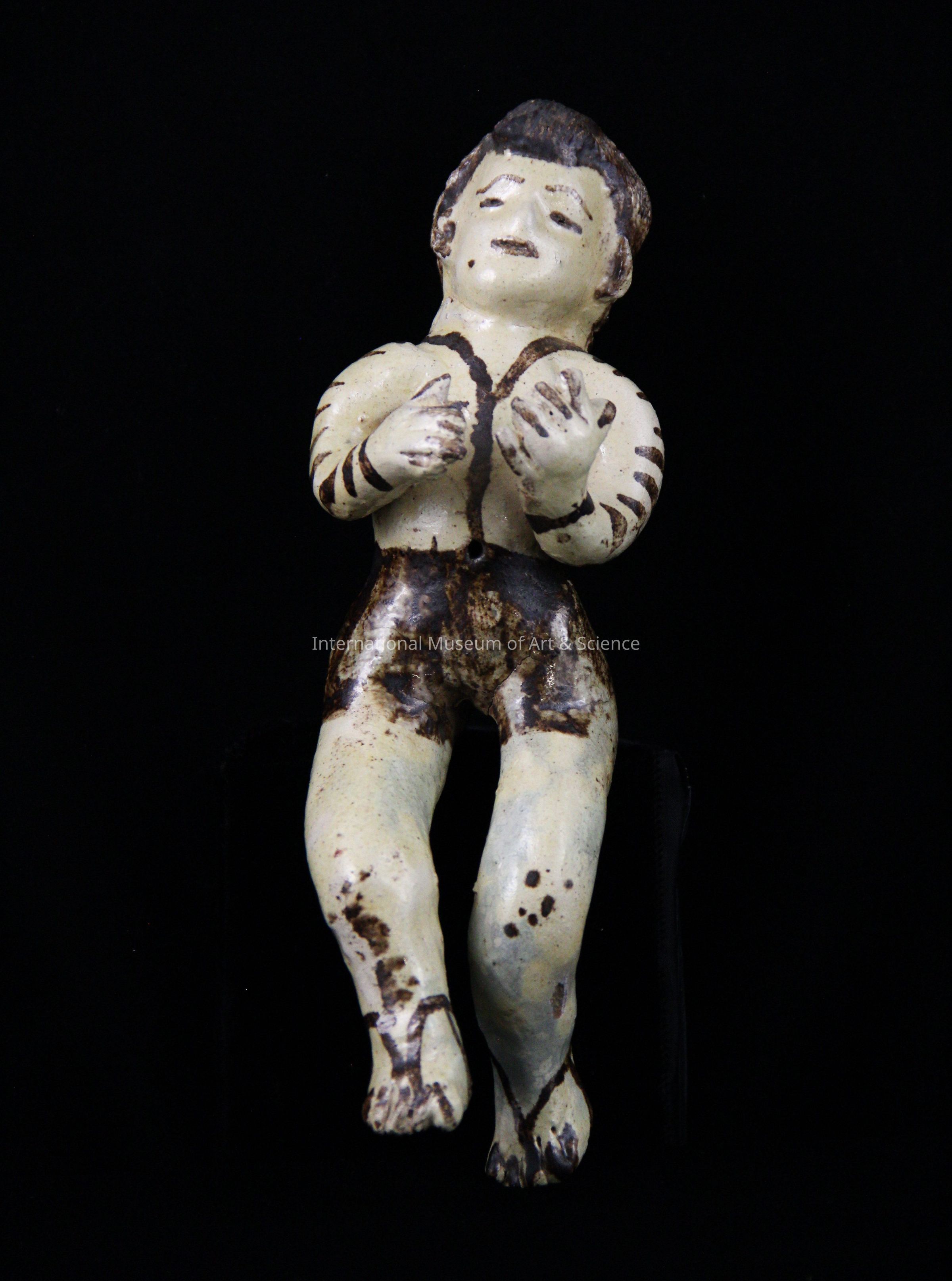 A Christ child figure painted with cream background, dark brown hair, striped shirt, brown diaper, and sandals. His his arms are on his chest. He is part of a Nativity scene.Ethnography